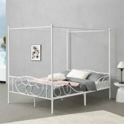 Cama Con Baldaquín Finström Marco Alto Con 4 Esquinas Acero 140 X 200 Cm – Blanco Mate [en.casa]