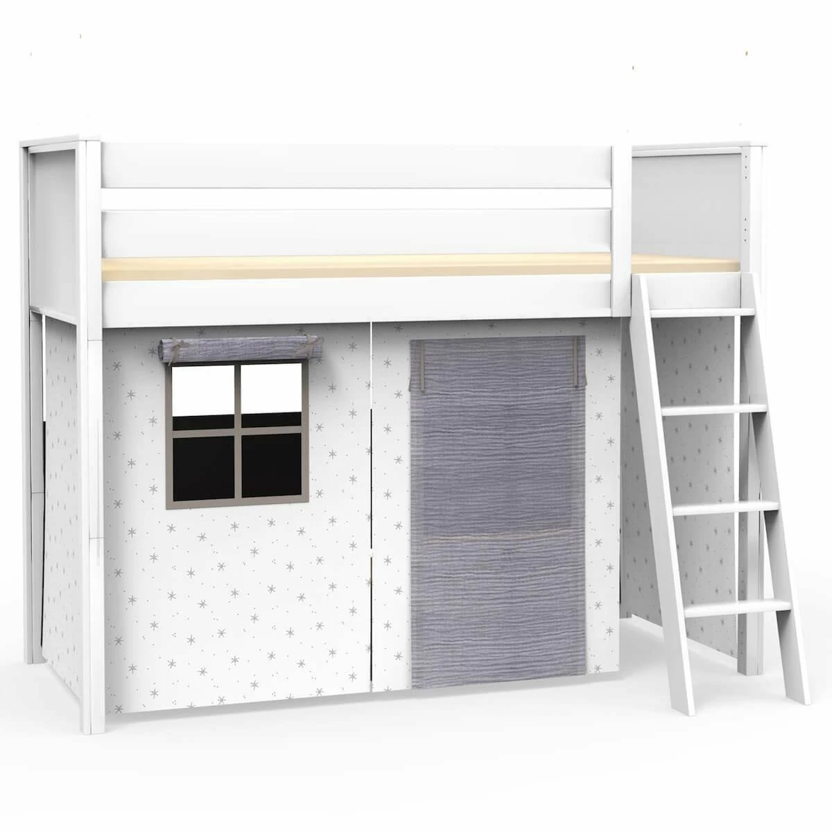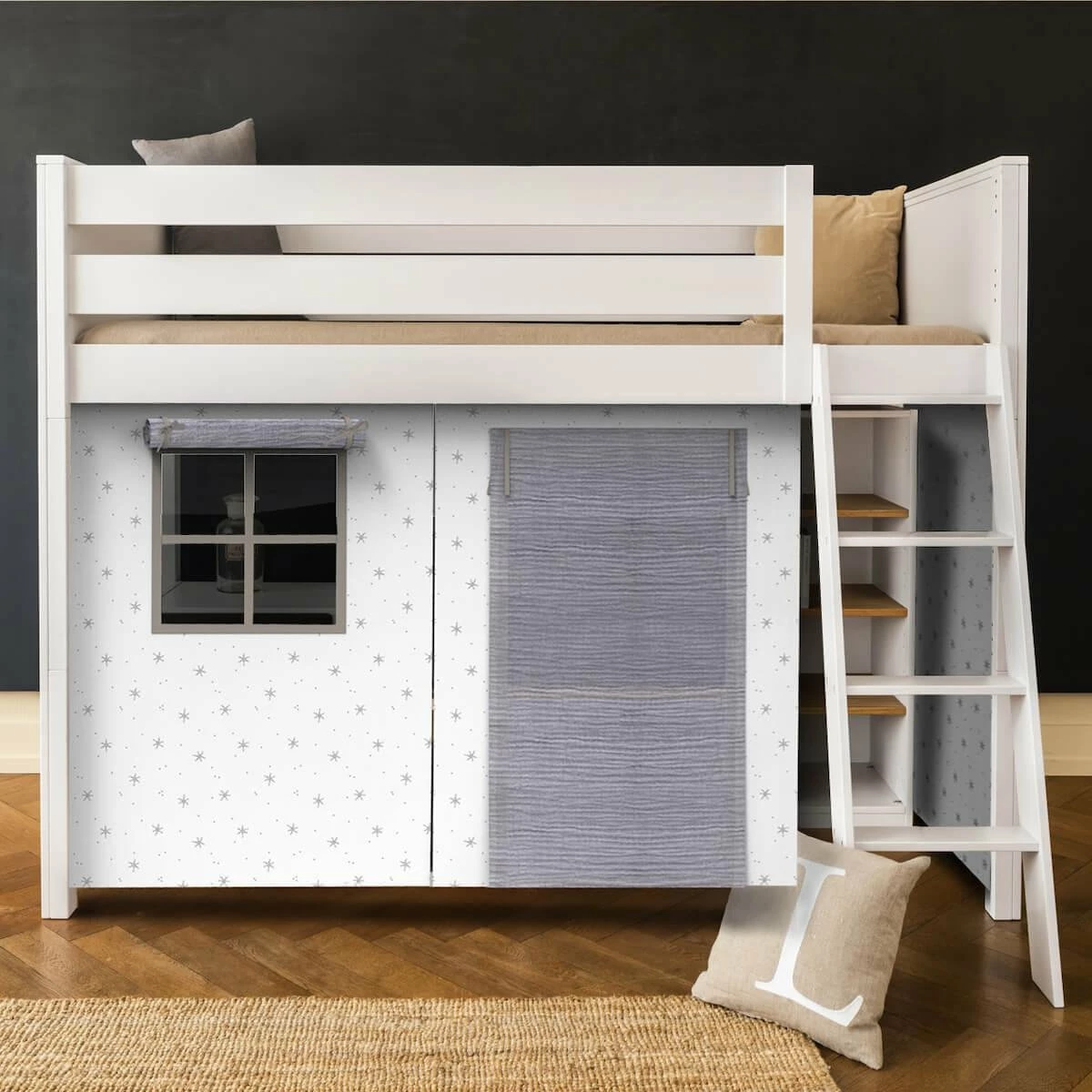 Haz feliz a tu peque con esta hermosa cama Kasva adornada con sus textiles en acabado Bobble. Allí podrá recibir a sus amigos y adaptará este espacio según sus deseos. Además, para optimizar el espacio en la habitación infantil, no hay nada como una cama alta. La cómoda altura bajo la cama permite crear una zona de escritorio gracias a las estanterías de la misma colección, una zona de descanso o ambas cosas. Esta cama también invita a todo tipo de juegos imaginativos, con la ayuda de nuestros textiles la cama puede transformarse en un escondite, un barco pirata o un lugar con secretos… En cuanto al diseño, sus líneas blancas puras aportan una nota de elegancia y sobriedad a la habitación.