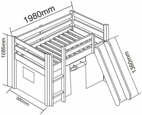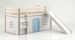 Venprodin | Fabricantes de muebles en España desde hace más de 10 años | Esta cama alta para niños está fabricada en madera de pino maciza y diseñada para entretener además de para optimizar el espacio. Color de la cama Blanco Decapé, en el que se ve la malla de la madera | La cama está equipada con barreras de protección en ambos bordes de la cama para evitar que los niños se caigan mientras duermen | El espacio debajo de la cama se puede usar para jugar, estudiar o para el almacenamiento. | La cama alta se entrega con un tobogán recreativo, además los somieres van incluidos | La cama es adecuada para un colchón de 90 x 190 cm. Tenga en cuenta que el colchón no está incluido en la entrega. Lona incluida en forma de casita. NO SE HACEN ENVIOS A BALEARES, CANARIAS, CEUTA Y MELILLA