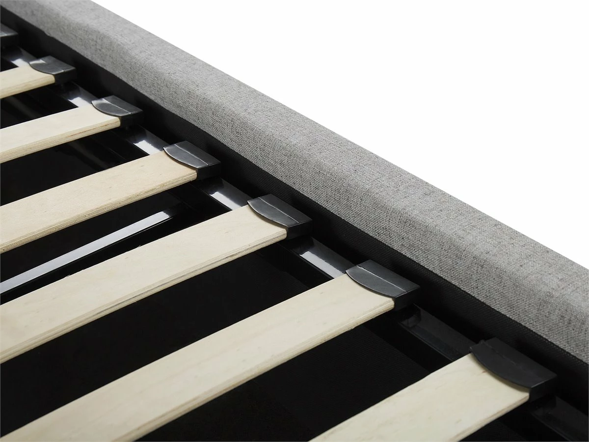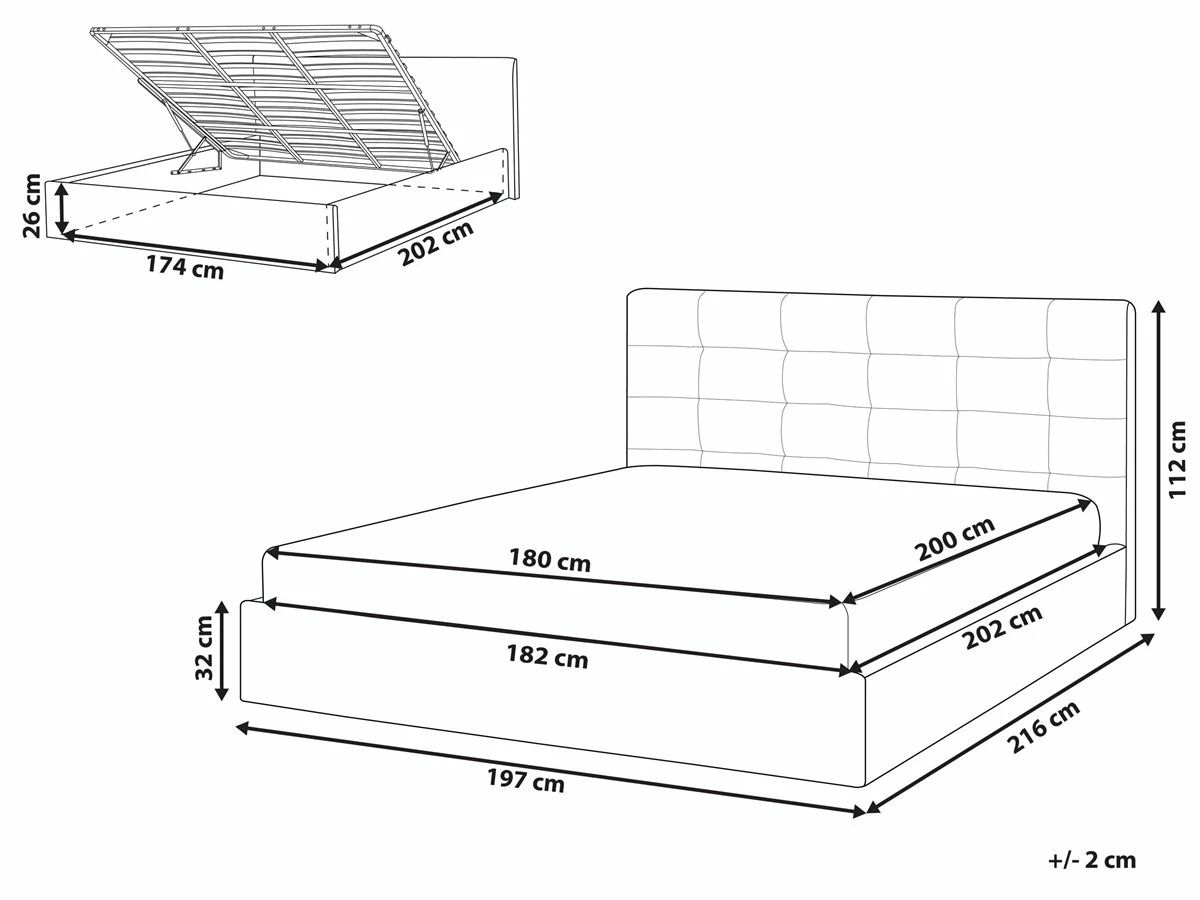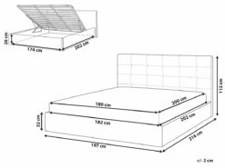 Cama de diseño moderno. Añade un toque acogedor a tu dormitorio con esta cama de diseño moderno. Está fabricada a partir de tela de poliéster y material resistente. El cabecero combina bien con cualquier estilo de decoración. El compartimento bajo el somier proporciona un espacio adicional para guardar la ropa de cama. Detalles: Tipo de Producto: Estructura de cama Estilo: Glamour Color: Gris Tonalidad: Gris claro Tipo de material: Tejido Material principal: Poliéster Material adicional: MDF Material del almacenamiento: Tela no tejida Composición del Material: 100% Poliéster Parte posterior tapizada: No Tipo de almacenamiento: Elevado Almacenamiento: Sí Dimensiones: Dimensiones del reposacabezas: 197×110 Ancho: 197 cm Dimensiones del almacenamiento: 174x202x26 Longitud: 216 cm Altura: 112 cm Superficie para dormir: 180×200 cm Peso: 54 kg Capacidad de peso: 300 kg La oferta incluye: 1 x Estructura de cama, 1 x Somier (45 listones flexibles, No incluye: colchón y ropa de cama Ventajas: La base de listones que absorbe los golpes proporciona un soporte perfecto, Espaciosa superficie para dormir, Alta calidad, El mecanismo de elevación neumático garantiza un fácil acceso al espacio de almacenamiento , Espacio de almacenamiento funcional Información de montaje: Requiere montaje completo. 45-60 min. Información adicional: La altura del colchón visible en la imagen es de 20 cm. Consejos de mantenimiento: Poliéster: 1.Aspire con un accesorio adecuado 2.Limpiar con champú seco y una esponja húmeda o un limpiador suave.