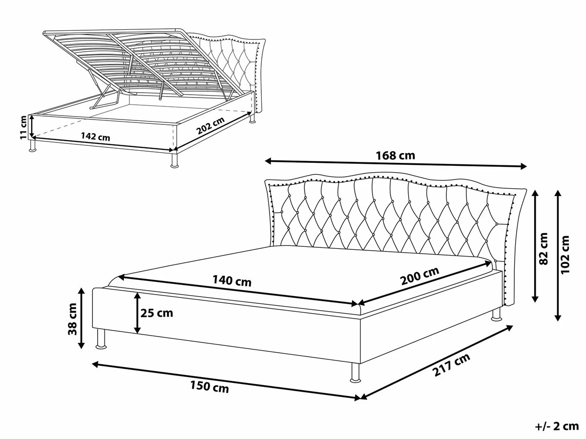 Cama de diseño glamuroso. Añade a tu dormitorio esta cama de diseño clásico. Está fabricada a partir de tela de poliéster de alta calidad. La estructura resistente garantiza un sueño saludable y proporciona soporte al colchón. El capitoné de botones y las tachuelas decorativas en el cabecero llaman poderosamente la atención. El amplio espacio de almacenaje optimiza la superficie disponible de la habitación. Detalles: Tipo de Producto: Cama matrimonial Estilo: Glamour Color: Gris Tonalidad: Gris claro Tipo de material: Tejido Material principal: Poliéster Material adicional: Metal Material del almacenamiento: Tablero de fibra Composición del Material: 100% Poliéster Parte posterior tapizada: Sí Tipo de almacenamiento: Elevado Almacenamiento: Sí Dimensiones: Dimensiones del reposacabezas: 176×82 Ancho: 168 cm Dimensiones del almacenamiento: 141x203x10.5 Longitud: 217 cm Altura: 102 cm Superficie para dormir: 140×200 cm Peso: 63 kg Capacidad de peso: 220 kg La oferta incluye: 1 x Somier (26 listones flexibles, 1 x Marco de cama con almacenamiento, No incluye: colchón y ropa de cama Ventajas: Distribución uniforme del peso corporal, Espaciosa superficie para dormir, Diseño elegante, Acolchado de alta calidad, Muy fácil de conservar, Espacio de almacenamiento funcional Información de montaje: Requiere montaje completo. Más de 60 min. Información adicional: La altura del colchón visible en la imagen es de 20 cm. El mecanismo de elevación hidráulica está destinado para los colchones cuyo peso no supera los 60 kg Consejos de mantenimiento: Poliéster: 1.Aspire con un accesorio adecuado 2.Limpiar con champú seco y una esponja húmeda o un limpiador suave. Acero: 1.Limpie con un limpiador y un paño suave, seque después 2.Para elementos de cobre o cromados, use agente abrillantador 3.Para evitar arañazos, no use limpiadores abrasivos.
