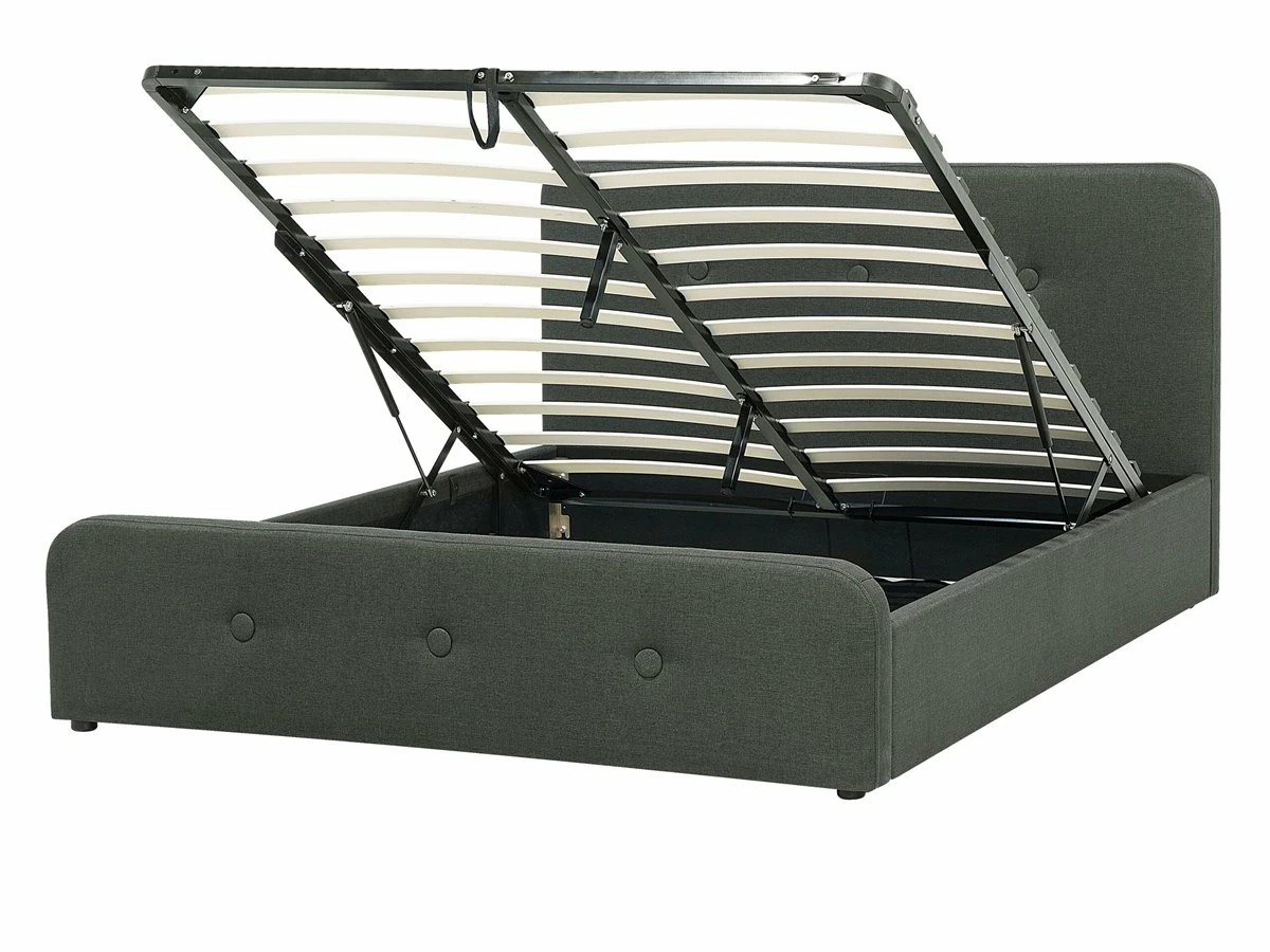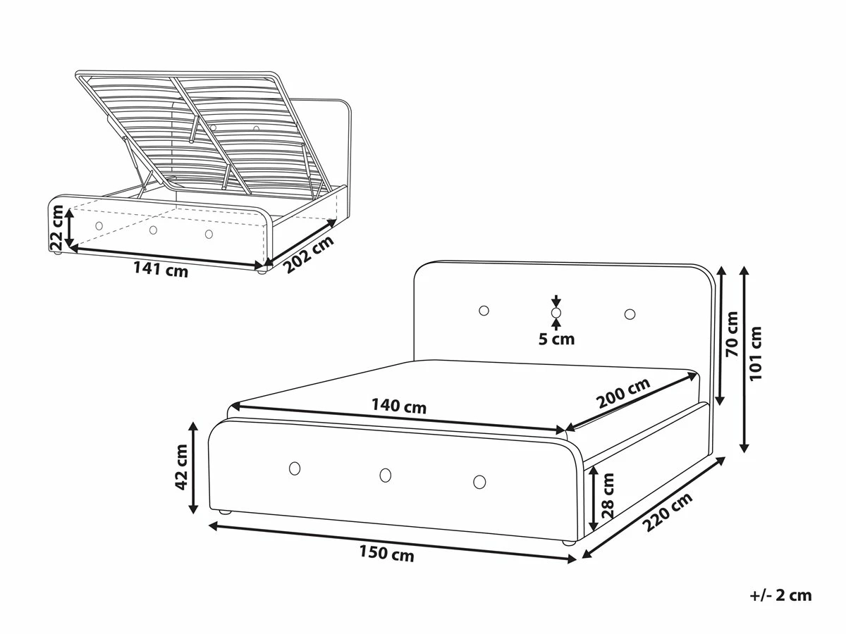Cama de diseño moderno. Añade comodidad y un estilo definido a tu dormitorio con esta cama con somier. Está fabricada a partir de tela de poliéster de alta calidad. Los botones decorativos en cabecero y pie de cama aportan un toque de distinción. Incluye un amplio espacio de almacenaje donde guardar la ropa de cama. Detalles: Tipo de Producto: Cama matrimonial Estilo: Retro Color: Gris Tonalidad: Gris oscuro Tipo de material: Tejido Material principal: Poliéster Material adicional: Madera Material del almacenamiento: Tela no tejida Composición del Material: 100% Poliéster Parte posterior tapizada: No Tipo de almacenamiento: Elevado Almacenamiento: Sí Dimensiones: Dimensiones del reposacabezas: 150×100 Ancho: 150 cm Dimensiones del almacenamiento: 140.5x202x21.5 Longitud: 220 cm Altura: 100 cm Superficie para dormir: 140×200 cm Peso: 55 kg Capacidad de peso: 350 kg La oferta incluye: 1 x Marco de cama con almacenamiento, 1 x Somier (24 listones flexibles, No incluye: colchón y ropa de cama Ventajas: Muy cómodo, Diseño elegante, Acolchado de alta calidad, Estructura duradera y sólida, Mantenimiento sencillo, El mecanismo de elevación neumático garantiza un fácil acceso al espacio de almacenamiento Información de montaje: Requiere montaje completo. 45-60 min. Información adicional: La altura del colchón visible en la imagen es de 20 cm. El mecanismo de elevación hidráulica está destinado para los colchones cuyo peso no supera los 60 kg Consejos de mantenimiento: Poliéster: 1.Aspire con un accesorio adecuado 2.Limpiar con champú seco y una esponja húmeda o un limpiador suave.