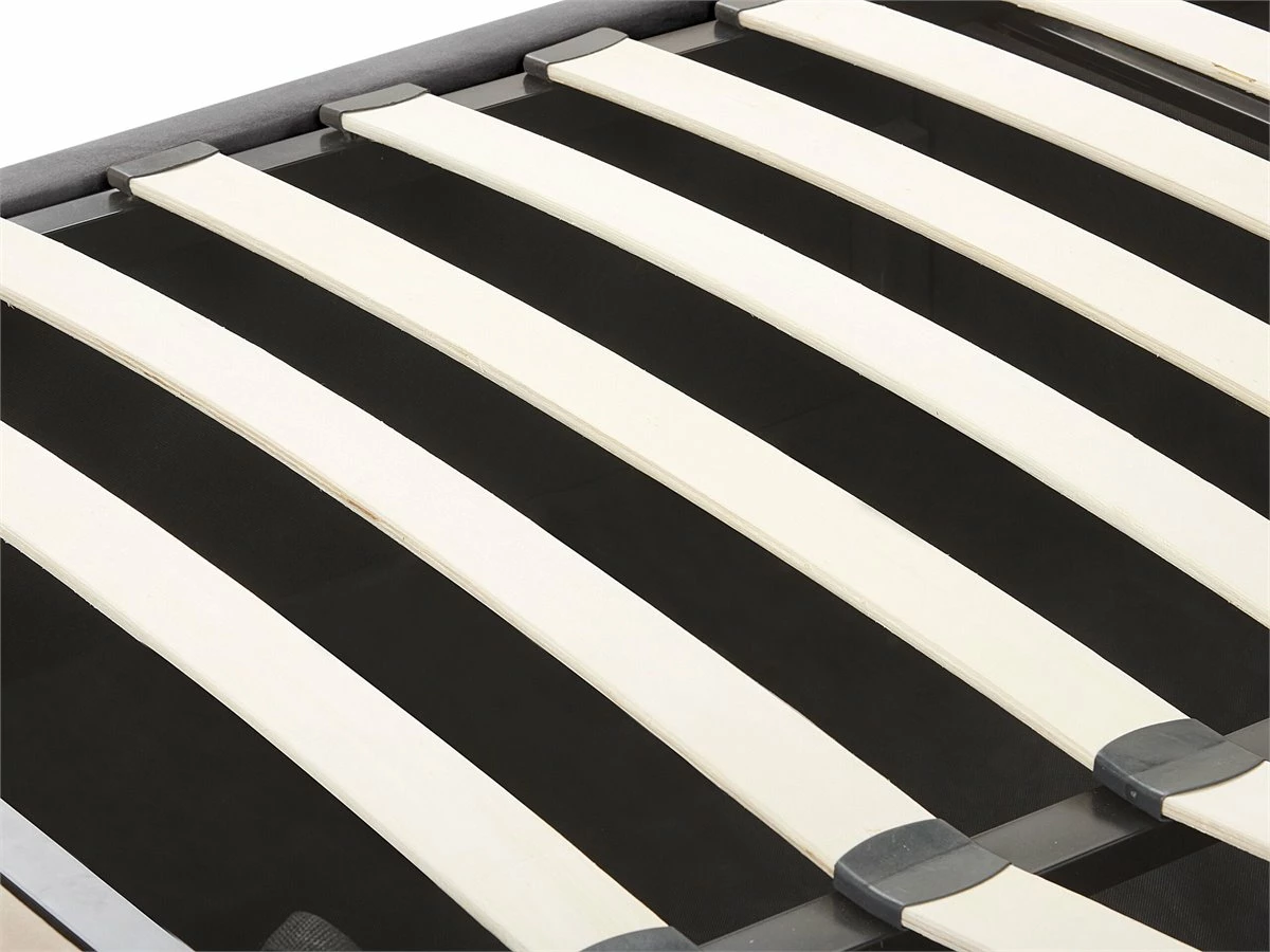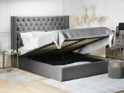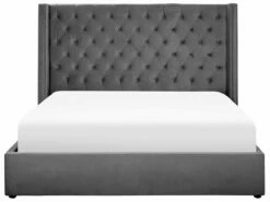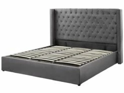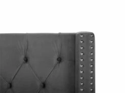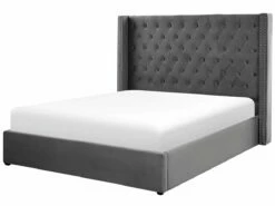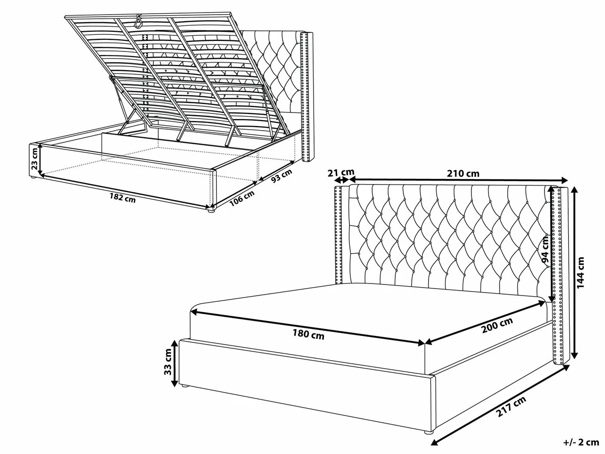Cama de diseño glamuroso. Añade un toque de glamour a tu dormitorio con esta cama con somier. Está fabricada a partir de terciopelo de alta calidad. Los botones decorativos y las tachuelas en el cabecero combinan bien con las patas. Ideal para interiores retro o contemporáneos. Incluye un espacio de almacenaje con ruedas donde guardar la ropa de cama. Detalles: Tipo de Producto: Cama matrimonial Estilo: Retro Color: Gris Tipo de material: Poliéster aterciopelado Material principal: Terciopelo Material adicional: Madera de pino Material del almacenamiento: Tela no tejida Composición del Material: 100% Poliéster Parte posterior tapizada: No Tipo de almacenamiento: Elevado Almacenamiento: Sí Dimensiones: Dimensiones del reposacabezas: 210×144 Ancho: 210 cm Dimensiones del almacenamiento: 182x199x23 Longitud: 217 cm Altura: 144 cm Superficie para dormir: 180×200 cm Peso: 75 kg Capacidad de peso: 250 kg La oferta incluye: 1 x Somier (42 listones flexibles, 1 x Marco de cama con almacenamiento, No incluye: colchón y ropa de cama Ventajas: La base de listones que absorbe los golpes proporciona un soporte perfecto, Elegante pieza decorativa, Acabado con remaches que enfatizan la forma del mueble, Combinación perfecta de colores y materiales, Estructura duradera y sólida, Completamente tapizado, Espacio de almacenamiento funcional Información de montaje: Requiere montaje completo. 45-60 min. Información adicional: La altura del colchón visible en la imagen es de 20 cm. Tenga en cuenta que la tela de terciopelo puede verse un poco diferente cuando se expone a una iluminación diferente: tiende a brillar más a la luz del día y parece más atenuada en la iluminación artificial interior. Debido a la estructura suave de alta densidad, el tono de la tela de terciopelo también puede variar cuando se pasa la mano en diferentes direcciones y ángulos. Para igualar el color y eliminar las arrugas, el material debe limpiarse con la palma de mano abierta en una dirección, limpiarse con un paño húmedo o una plancha con vapor. Consejos de mantenimiento: Terciopelo: 1.Limpiar con champú seco y una esponja húmeda o un limpiador suave 2.Aspire con un accesorio adecuado.
