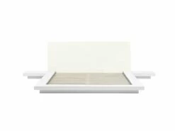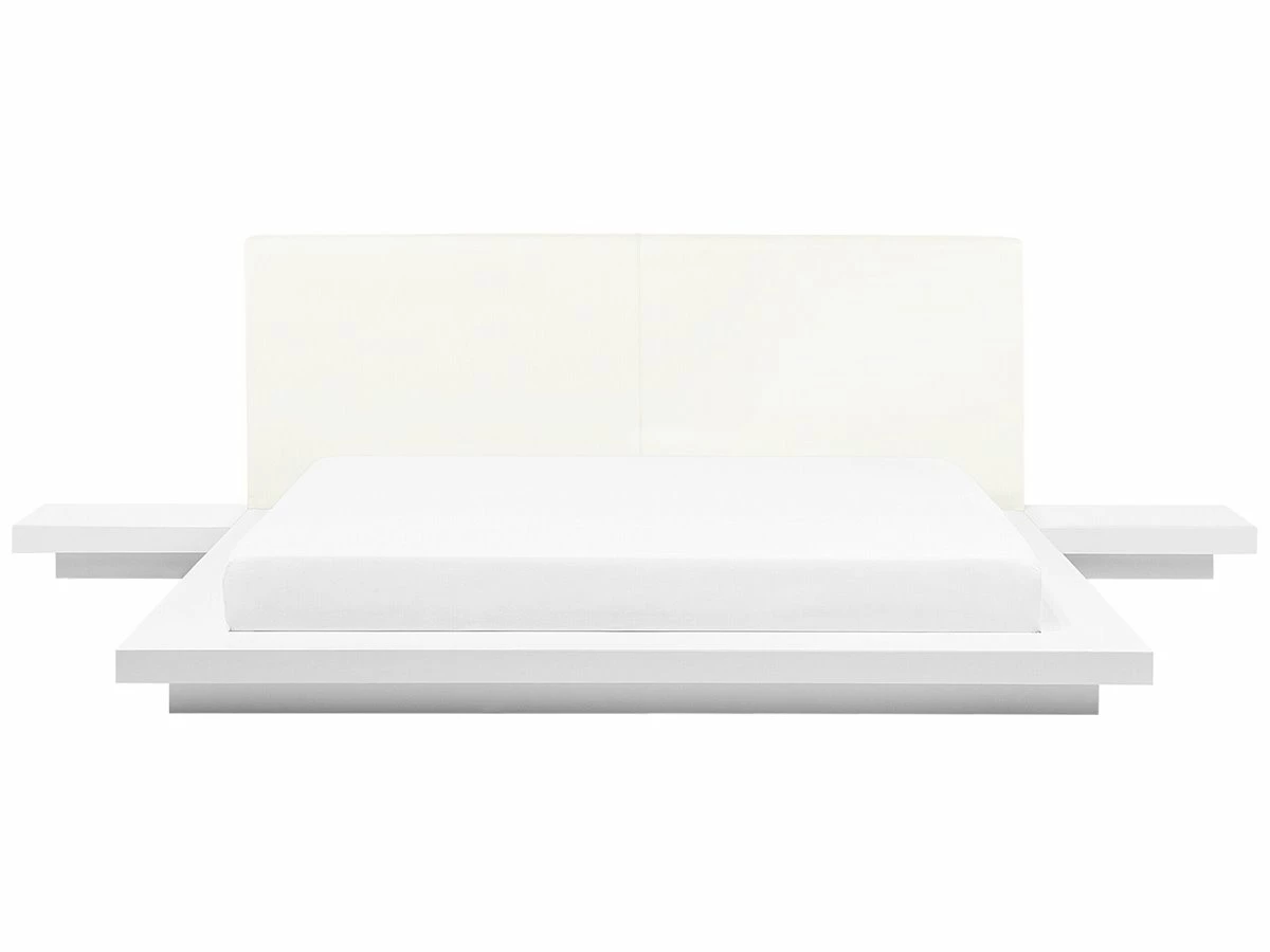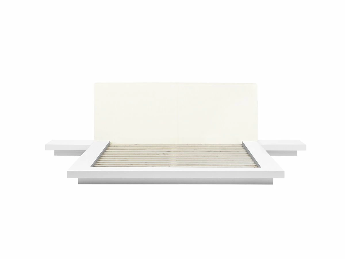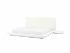 Cama de plataforma con mesas de noche. Añade a tu dormitorio esta cama con somier de inspiración asiática. Está fabricada a partir de MDF de alta calidad con acabado en madera. Las patas de madera maciza combinan bien con el cabecero de piel sintética. Las mesas de noche a los laterales completan el diseño. Detalles: Tipo de Producto: Cama matrimonial Estilo: Moderno Color: Blanco Tipo de material: Derivado de madera Material principal: MDF Material adicional: Acero Composición del Material: 100% Piel ecológica Parte posterior tapizada: No Acabado: Enchapado Dimensiones: Dimensiones del reposacabezas: 217×86 Ancho: 328 cm Longitud: 229 cm Altura: 86 cm Superficie para dormir: 180×200 cm Peso: 112 kg Capacidad de peso: 350 kg La oferta incluye: 1 x Somier (14 listones, 1 x Estructura de cama, 2 x Mesitas de noche, No incluye: colchón y ropa de cama Ventajas: La base de listones que absorbe los golpes proporciona un soporte perfecto, Espaciosa superficie para dormir, Diseño elegante, Solida estructura, Apariencia moderna y calidad durante muchos años Información de montaje: Requiere montaje completo. Más de 60 min. Información adicional: La altura del colchón visible en la imagen es de 20 cm. Consejos de mantenimiento: MDF: 1.Limpiar con un limpiador suave y un paño suave. Secar después de limpiar. Piel sintética: 1.Aspire con un accesorio adecuado 2.Una vez a la semana, limpie con un paño húmedo y seque después. No engrasar, 3.Use solo limpiadores suaves y acondicionadores dedicados a la piel sintética, 4.Limpie con agua destilada y use limpiadores a base de jabón en las manchas difíciles.