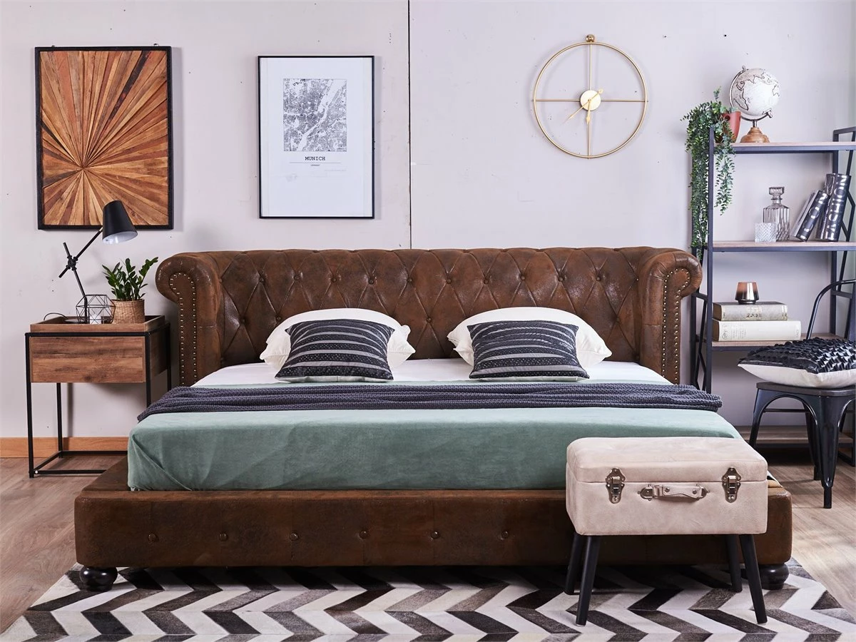 Cama de estilo Chesterfield. Esta cama con somier de inspiraci贸n vintage combina bien en cualquier dormitorio moderno o retro. Est谩 fabricada a partir de gamuza sint茅tica de alta calidad. El aspecto envejecido, el capiton茅 y las tachuelas aportan un toque de distinci贸n. La decoraci贸n del cabecero est谩 inspirada en las formas Chesterfield. Detalles: Tipo de Producto: Cama matrimonial Estilo: Retro Color: Marr贸n Tipo de material: Piel sint茅tica Material principal: Gamuza sint茅tica Material adicional: Madera contrachapada Composici贸n del Material: 100% Poli茅ster Parte posterior tapizada: No Dimensiones: Dimensiones del reposacabezas: 205×85 Ancho: 205 cm Longitud: 246 cm Altura: 93 cm Superficie para dormir: 160×200 cm Peso: 64 kg Capacidad de peso: 220 kg La oferta incluye: 1 x Estructura de cama, 1 x Somier (24 listones flexibles, No incluye: colch贸n y ropa de cama Ventajas: La base de listones que absorbe los golpes proporciona un soporte perfecto, Aspecto elegante estilo Chesterfield, Estilo retro, Combinaci贸n perfecta de colores y materiales, Estructura duradera y s贸lida Informaci贸n de montaje: Requiere montaje completo. 20-40 min. Informaci贸n adicional: La altura del colch贸n visible en la imagen es de 20 cm. Consejos de mantenimiento: Poli茅ster: 1.Aspire con un accesorio adecuado 2.Limpiar con champ煤 seco y una esponja h煤meda o un limpiador suave. Madera: 1.Seque inmediatamente despu茅s de limpiar. para evitar que se acumule agua en los muebles 2.Limpie con un limpiador y un pa帽o suave en la direcci贸n del grano 3.Los muebles con acabado de aceite deben engrasarse una vez al a帽o