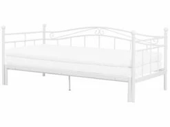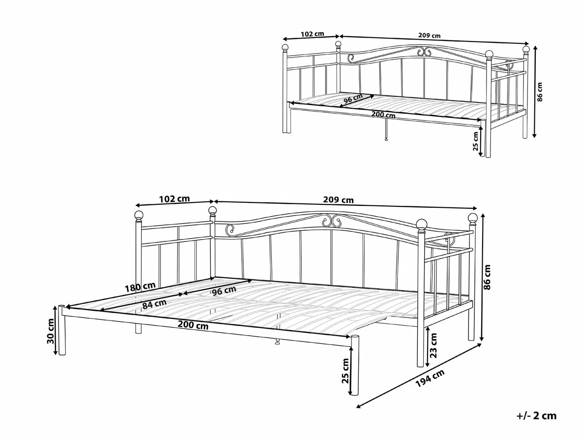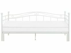 Cama extensible. Esta cama con somier es ideal para habitaciones de dimensiones reducidas. Está fabricada a partir de metal de alta calidad. La extensión extraíble da la posibilidad de convertirla en una cama doble. Multifuncional, se puede utilizar como sofá durante el día y como cama o cómoda durante la noche. Detalles: Tipo de Producto: Sofá cama Estilo: Moderno Color: Blanco Tipo de material: Metal Material principal: Metal Material adicional: Madera contrachapada Parte posterior tapizada: No Acabado: Mate Dimensiones: Dimensiones del reposacabezas: 207×63 Ancho: 102/194 cm Longitud: 209 cm Altura: 86 cm Superficie para dormir: 90×200 cm Peso: 32 kg Capacidad de peso: 250 kg La oferta incluye: 1 x Marco de rejilla (27 listones flexibles, 1 x Estructura de cama, No incluye: colchón y ropa de cama Ventajas: La superficie para dormir se puede aumentar gracias al marco extraíble, Para dormitorio o salón, Diseño atemporal, Materiales de la más alta calidad, Mantenimiento sencillo Información de montaje: Requiere montaje completo. 45-60 min. Información adicional: Se recomienda el uso de un colchón con un grosor máximo de 10 cm. Esto permite colocar dos colchones, uno encima del otro, cuando la cama está plegada. Consejos de mantenimiento: Metal: 1.Limpie con un limpiador y un paño suave, seque después 2.Para elementos de cobre o cromados, use agente abrillantador 3.Para evitar arañazos, no use limpiadores abrasivos. Madera contrachapada: 1.Limpiar con un limpiador suave y un paño suave. Secar después de limpiar.