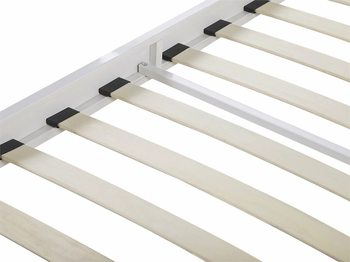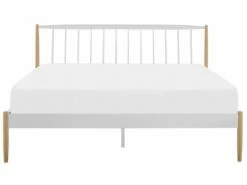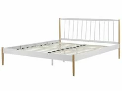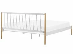 Cama de estilo escandinavo. Esta cama con somier combina bien en dormitorios de inspiración retro o escandinavo. Está fabricada a partir de metal de alta calidad. El cabecero alto ofrece la mayor comodidad para leer un libro o ver la TV. Completa el diseño con mantas, cojines o almohadas a juego. Detalles: Tipo de Producto: Cama matrimonial Estilo: Tradicional Color: Blanco Tipo de material: Metal Material principal: Metal Material adicional: Madera de álamo Parte posterior tapizada: No Acabado: Mate Dimensiones: Dimensiones del reposacabezas: 181×63 Ancho: 181 cm Longitud: 205 cm Altura: 100 cm Superficie para dormir: 180×200 cm Peso: 27 kg Capacidad de peso: 250 kg La oferta incluye: 1 x Estructura de cama, 1 x Somier (Láminas: 36, No incluye: colchón y ropa de cama Ventajas: Apto para cualquier tipo de colchón, La base de listones que absorbe los golpes proporciona un soporte perfecto, Estilo escandinavo minimalista, Materiales de la más alta calidad, Mantenimiento sencillo Información de montaje: Requiere montaje completo. 45-60 min. Información adicional: La altura del colchón visible en la imagen es de 20 cm. Consejos de mantenimiento: Metal: 1.Para evitar arañazos, no use limpiadores abrasivos 2.Limpie con un limpiador y un paño suave, seque después 3.Para elementos de cobre o cromados, use agente abrillantador. Madera de álamo: 1.Limpiar con un limpiador suave y un paño suave. Secar después de limpiar.