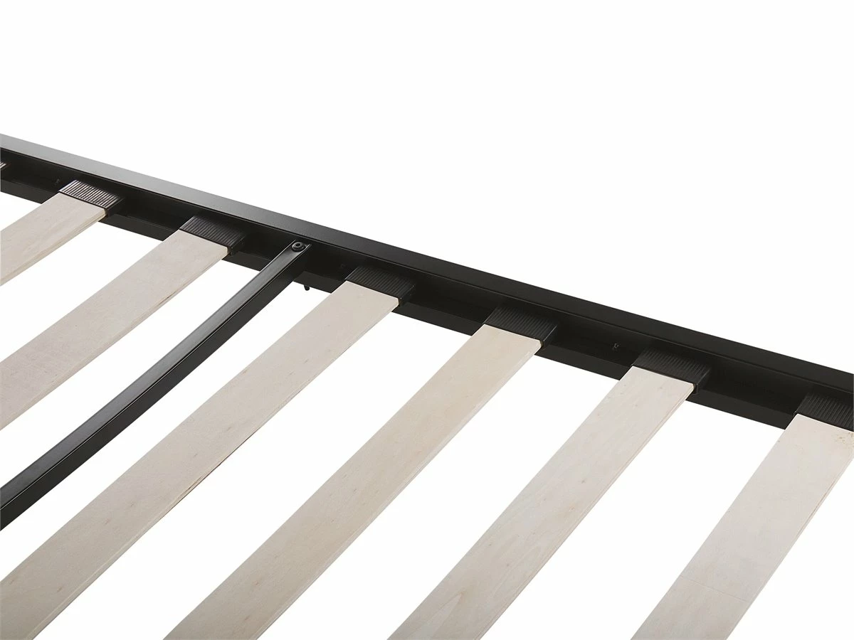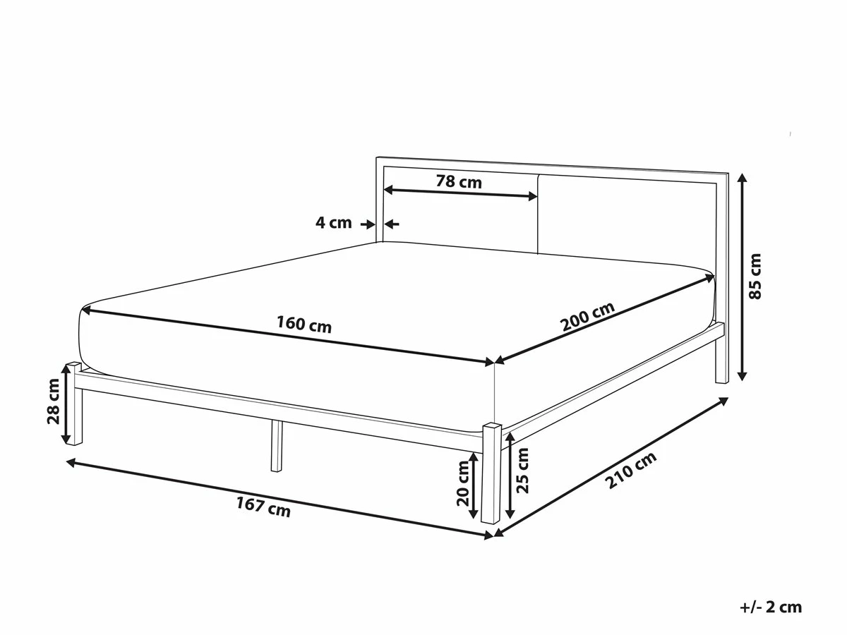 Cama de diseño industrial. Esta cama con somier de diseño minimalista combina bien en cualquier dormitorio moderno, industrial o tradicional. Está fabricada a partir de metal de alta calidad. El somier de listones garantiza un flujo de aire adecuado y una distribución uniforme del peso corporal. Las patas resistentes ofrecen la máxima estabilidad. Detalles: Tipo de Producto: Cama matrimonial Estilo: Moderno Color: Negro Tipo de material: Metal Material principal: Metal Material adicional: Poliéster Composición del Material: 100% Poliéster Parte posterior tapizada: No Acabado: Revestimiento en polvo Dimensiones: Dimensiones del reposacabezas: 167×60 Ancho: 167 cm Longitud: 210 cm Altura: 85 cm Superficie para dormir: 160×200 cm Peso: 30 kg Capacidad de peso: 200 kg La oferta incluye: 1 x Estructura de cama, 1 x Somier (24 listones flexibles, No incluye: colchón y ropa de cama Ventajas: El marco integrado garantiza la máxima estabilización, Combina con cualquier estilo de interior, Diseño moderno, Materiales de la más alta calidad, Solida estructura Información de montaje: Requiere montaje completo. 45-60 min. Información adicional: La altura del colchón visible en la imagen es de 20 cm. Consejos de mantenimiento: Metal: 1.Para elementos de cobre o cromados, use agente abrillantador 2.Para evitar arañazos, no use limpiadores abrasivos 3.Limpie con un limpiador y un paño suave, seque después. Poliéster: 1.Aspire con un accesorio adecuado 2.Limpiar con champú seco y una esponja húmeda o un limpiador suave.