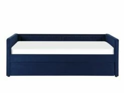Cama nido de diseño moderno. Añade elegancia y funcionalidad a tu dormitorio o habitación infantil con esta cama con somier. Está fabricada a partir de pana de alta calidad y suave al tacto. El somier de láminas garantiza una distribución uniforme del peso. La parte inferior se puede extraer con facilidad, proporcionando una superficie adicional para dormir. Las tachuelas decorativas de estilo tradicional completan el diseño. Detalles: Tipo de Producto: Sofá cama Estilo: Moderno Color: Azul Tonalidad: Azul marino Tipo de material: Tejido Material principal: Pana Material adicional: Madera contrachapada Composición del Material: 100% Poliéster Parte posterior tapizada: Sí Dimensiones: Dimensiones del reposacabezas: 76×100 Ancho: 184 cm Longitud: 216 cm Altura: 76 cm Superficie para dormir: 90×200 cm Peso: 57 kg Capacidad de peso: 150 kg La oferta incluye: 1 x Estructura de cama, 2 x Somier (30 listones flexibles, No incluye: colchón y ropa de cama Ventajas: La base de listones que absorbe los golpes proporciona un soporte perfecto, Segunda cama extraíble para usar si es necesario, Diseño tradicional con un toque moderno, Acolchado de alta calidad, Estructura duradera y sólida Información de montaje: Requiere montaje completo Información adicional: El grosor del colchón para la cama inferior no deberá ser mayor a 20 cm. Consejos de mantenimiento: Pana: 1.Aspire con un accesorio adecuado 2.Limpiar con champú seco y una esponja húmeda o un limpiador suave.