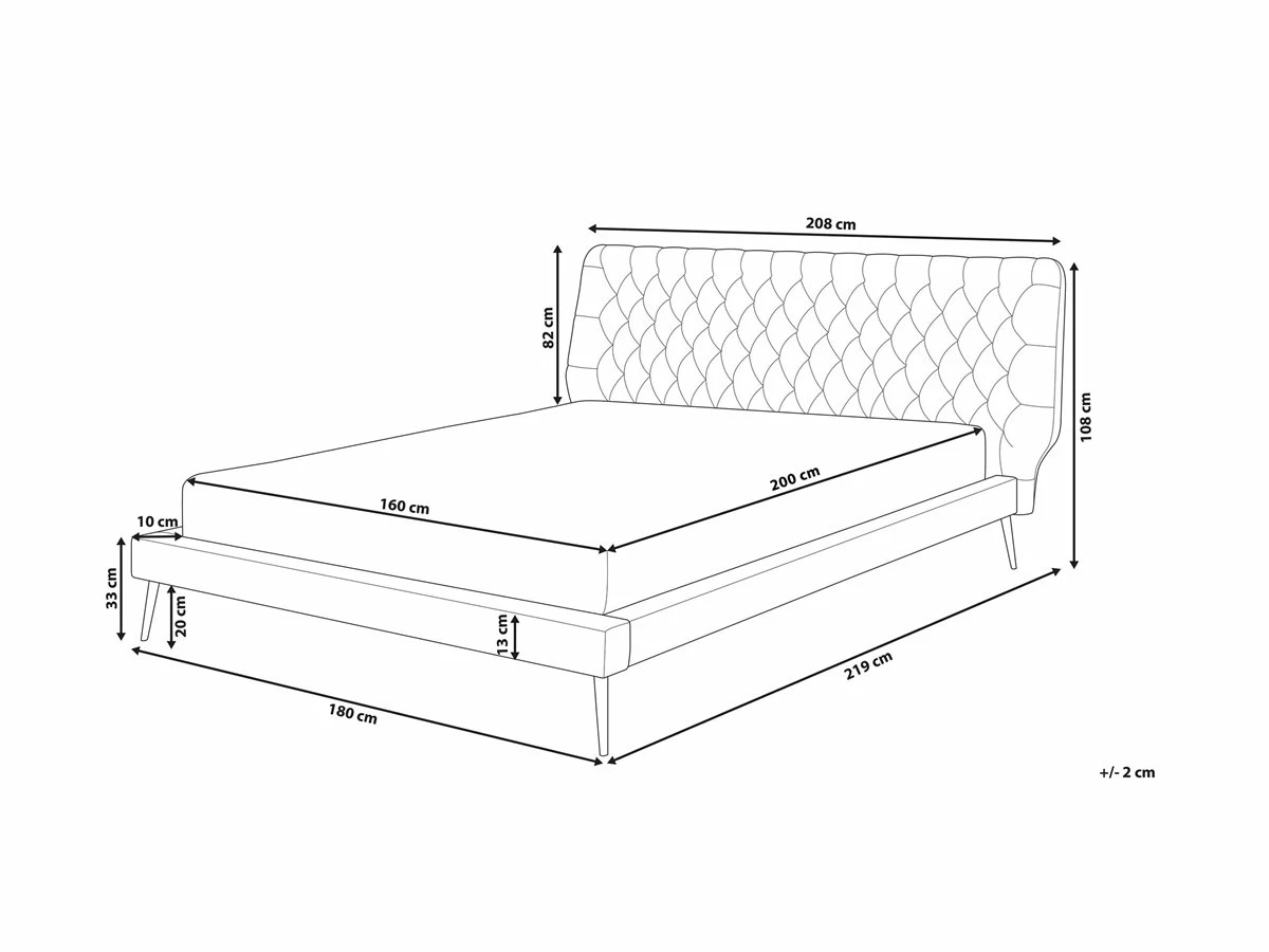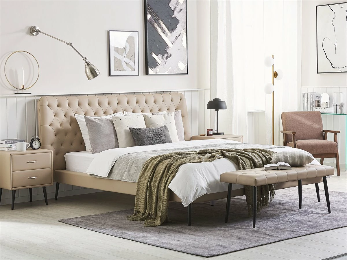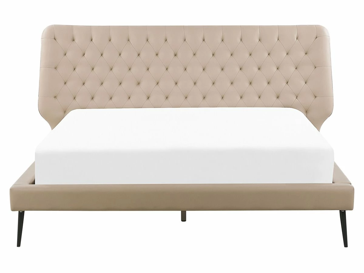 Cama de diseño moderno. Añade modernidad a tu dormitorio con esta cama con somier. Está fabricada a partir de piel sintética de alta calidad y bajo mantenimiento. El somier de listones garantiza un sueño saludable y una distribución uniforme del peso corporal. El cabecero capitoné aporta un toque de distinción. Detalles: Tipo de Producto: Cama matrimonial Estilo: Moderno Color: Beige Tipo de material: Piel sintética Material principal: Piel sintética Material adicional: Metal Composición del Material: 100% Poliéster Parte posterior tapizada: No Dimensiones: Dimensiones del reposacabezas: 208×88 Ancho: 219 cm Longitud: 208 cm Altura: 108 cm Superficie para dormir: 160×200 cm Peso: 47 kg Capacidad de peso: 350 kg La oferta incluye: 1 x Estructura de cama, 1 x Somier (26 listones flexibles, No incluye: colchón y ropa de cama Ventajas: La base de listones que absorbe los golpes proporciona un soporte perfecto, Espaciosa superficie para dormir, Crea un ambiente acogedor, Con un clásico mechón decorativo, Estructura duradera y sólida Información de montaje: Requiere montaje completo. 20-40 min. Información adicional: La altura del colchón visible en la imagen es de 20 cm. Consejos de mantenimiento: Piel sintética: 1.Use solo limpiadores suaves y acondicionadores dedicados a la piel sintética, 2.Limpie con agua destilada y use limpiadores a base de jabón en las manchas difíciles 3.Aspire con un accesorio adecuado 4.Una vez a la semana, limpie con un paño húmedo y seque después. No engrasar Metal: 1.Para evitar arañazos, no use limpiadores abrasivos 2.Limpie con un limpiador y un paño suave, seque después 3.Para elementos de cobre o cromados, use agente abrillantador.
