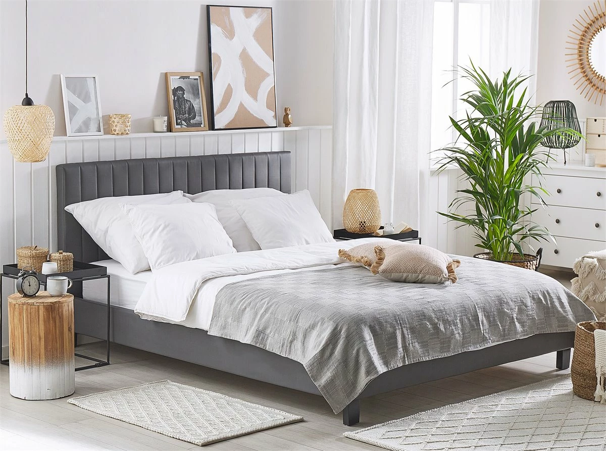 Cama de diseño moderno. Añade un toque de modernidad a tu dormitorio con esta cama con somier. Está fabricada a partir de tela de poliéster de alta calidad y bajo mantenimiento. El somier de listones garantiza un sueño saludable y proporciona soporte al colchón. El cabecero decorativo ofrece comodidad y las patas de metal complementan el estilo. Detalles: Tipo de Producto: Cama matrimonial Estilo: Moderno Color: Gris Tonalidad: Gris claro Tipo de material: Tejido Material principal: Poliéster Material adicional: Madera contrachapada Composición del Material: 100% Poliéster Parte posterior tapizada: No Dimensiones: Dimensiones del reposacabezas: 171×88 Ancho: 171 cm Longitud: 215 cm Altura: 99 cm Superficie para dormir: 160×200 cm Peso: 30 kg Capacidad de peso: 300 kg La oferta incluye: 1 x Estructura de cama, 1 x Somier (26 listones flexibles, No incluye: colchón y ropa de cama Ventajas: Distribución uniforme del peso corporal, Espaciosa superficie para dormir, Diseño moderno, Acolchado de alta calidad, No requiere mantenimiento regular, Estructura sólida y estable Información de montaje: Requiere montaje completo. 20-40 min. Información adicional: La altura del colchón visible en la imagen es de 20 cm. Consejos de mantenimiento: Poliéster: 1.Aspire con un accesorio adecuado 2.Limpiar con champú seco y una esponja húmeda o un limpiador suave.