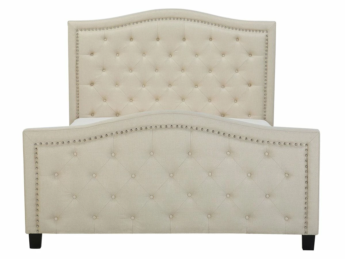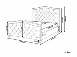 Cama de diseño glamuroso. Añade un toque vintage a tu dormitorio con esta cama con somier. Está fabricada a partir de tela de poliéster de alta calidad. El somier de listones garantiza un sueño saludable y una distribución uniforme del peso. Los botones decorativos y las tachuelas en el cabecero y el pie de cama aportan una cierta nota de glamour. Detalles: Tipo de Producto: Cama matrimonial Estilo: Retro Color: Beige Tipo de material: Tejido Material principal: Poliéster Material adicional: Madera de pino Composición del Material: 100% Poliéster Parte posterior tapizada: No Dimensiones: Dimensiones del reposacabezas: 174×131 Ancho: 174 cm Longitud: 216 cm Altura: 144 cm Superficie para dormir: 160×200 cm Peso: 58 kg Capacidad de peso: 250 kg La oferta incluye: 1 x Somier (30 listones flexibles, 1 x Estructura de cama, No incluye: colchón y ropa de cama Ventajas: La base de listones que absorbe los golpes proporciona un soporte perfecto, Espaciosa superficie para dormir, Acabado con remaches que enfatizan la forma del mueble, Diseño elegante, Acolchado con botones decorativos, Acolchado de alta calidad Información de montaje: Requiere montaje completo. 20-40 min. Información adicional: La altura del colchón visible en la imagen es de 20 cm. Consejos de mantenimiento: Poliéster: 1.Aspire con un accesorio adecuado 2.Limpiar con champú seco y una esponja húmeda o un limpiador suave. Madera de pino: 1.Los muebles con acabado de aceite deben engrasarse una vez al año, 2.Seque inmediatamente después de limpiar. para evitar que se acumule agua en los muebles 3.Limpie con un limpiador y un paño suave en la dirección del grano.