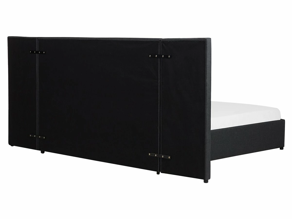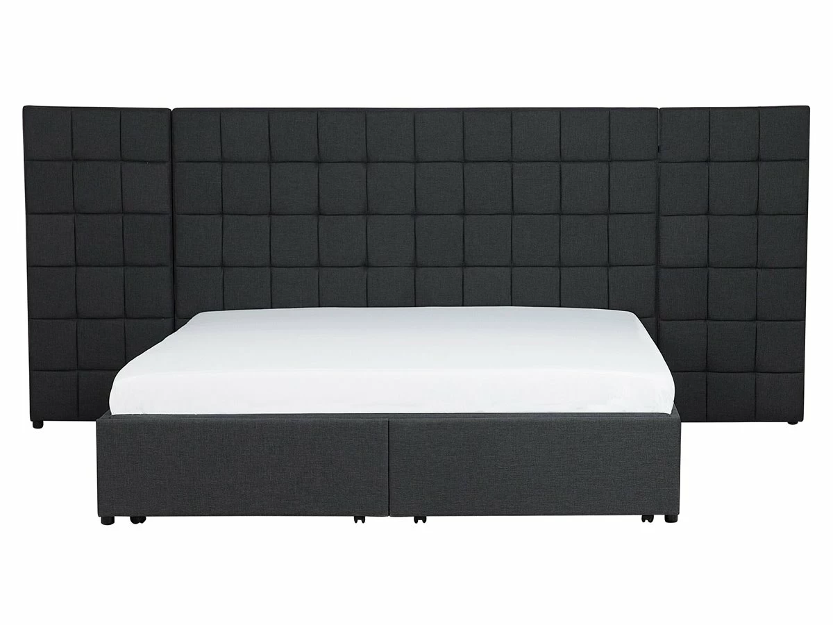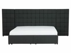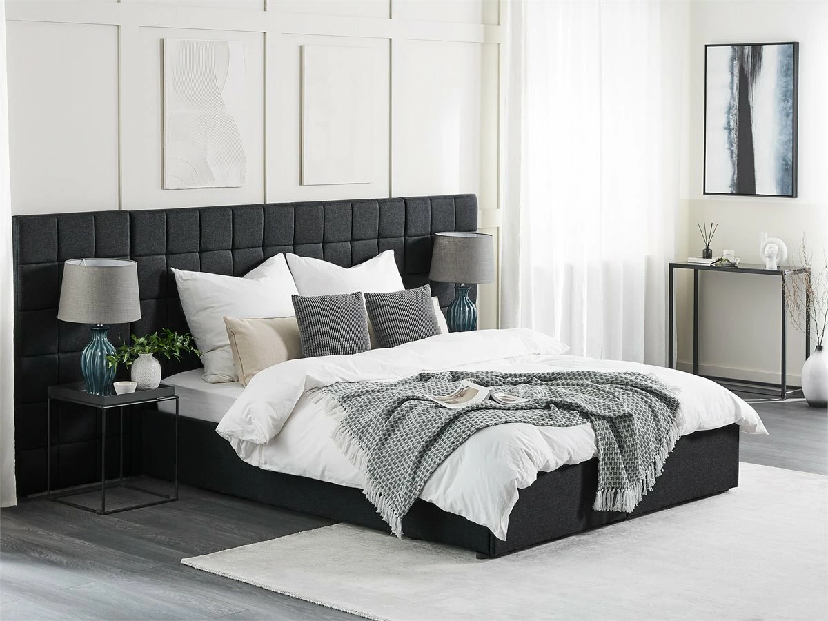 Cama de diseño moderno. Añade modernidad a tu dormitorio con esta cama con somier. Está fabricada a partir de tela de poliéster de alta calidad. El somier de listones garantiza un sueño saludable y una distribución uniforme del peso corporal. El cabecero de gran tamaño llama poderosamente la atención. Incluye un espacio de almacenaje donde guardar la ropa de cama. Detalles: Tipo de Producto: Cama matrimonial Estilo: Moderno Color: Gris Tonalidad: Gris oscuro Tipo de material: Tejido Material principal: Poliéster Material adicional: Material sintético Material del almacenamiento: Tablero de fibra Composición del Material: 100% Poliéster Parte posterior tapizada: No Tipo de almacenamiento: Cajones Almacenamiento: Sí Dimensiones: Dimensiones del reposacabezas: 300×124 Ancho: 300 cm Longitud: 214 cm Altura: 124 cm Superficie para dormir: 160×200 cm Peso: 81 kg Capacidad de peso: 220 kg La oferta incluye: 2 x Cajón de almacenaje, 1 x Estructura de cama, 1 x Somier (28 listones flexibles, No incluye: colchón y ropa de cama Ventajas: Cajones con estable mecanismo de abertura, Diseño moderno, Combina con todo tipo de decoración, Construcción muy estable, Acolchado de alta calidad, Espacio de almacenamiento funcional Información de montaje: Requiere montaje completo. 45-60 min. Información adicional: La altura del colchón visible en la imagen es de 20 cm. Consejos de mantenimiento: Poliéster: 1.Aspire con un accesorio adecuado 2.Limpiar con champú seco y una esponja húmeda o un limpiador suave.