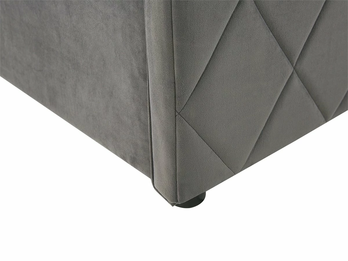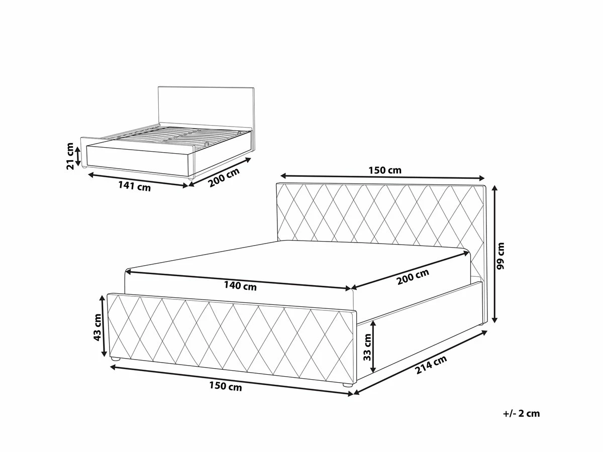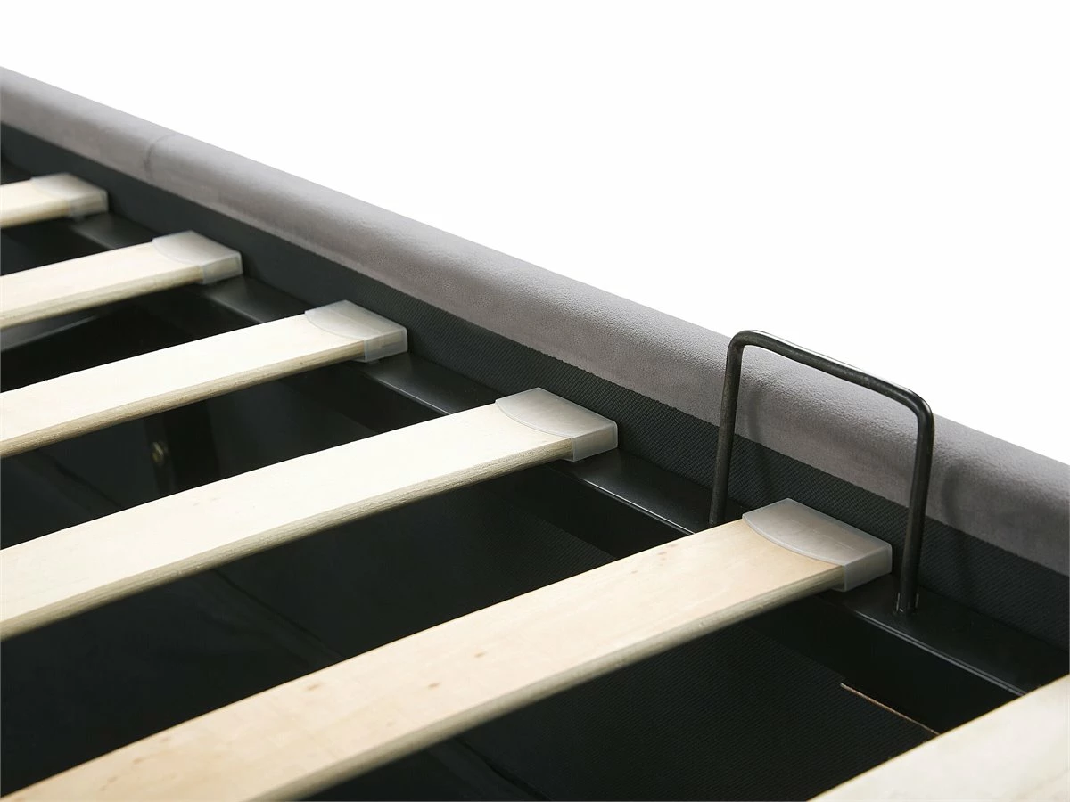 Cama con almacenaje. Añade elegancia y funcionalidad a tu dormitorio con esta cama con somier. Está fabricada a partir de terciopelo de alta calidad. El somier de listones proporciona soporte al colchón. Puedes montarlo para abrir por el lado derecho o izquierdo de la cama. El capitoné decorativo aporta un toque de distinción a cualquier interior. Incluye un amplio espacio de almacenaje donde guardar la ropa de cama. Detalles: Tipo de Producto: Cama matrimonial Estilo: Moderno Color: Gris Tipo de material: Poliéster aterciopelado Material principal: Terciopelo Material adicional: Material sintético Material del almacenamiento: Tela no tejida Composición del Material: 100% Poliéster Parte posterior tapizada: No Tipo de almacenamiento: Elevado Almacenamiento: Sí Dimensiones: Dimensiones del reposacabezas: 150×99 Ancho: 150 cm Dimensiones del almacenamiento: 21x141x200 Longitud: 214 cm Altura: 99 cm Superficie para dormir: 140×200 cm Peso: 50 kg Capacidad de peso: 200 kg La oferta incluye: 1 x Marco de cama con almacenamiento, 1 x Somier (24 listones flexibles, No incluye: colchón y ropa de cama Ventajas: La base de listones que absorbe los golpes proporciona un soporte perfecto, Distribución uniforme del peso corporal, El almacenamiento se puede montar para abrir desde el lado derecho o izquierdo, Espaciosa superficie para dormir, Diseño elegante, Espacio de almacenamiento funcional Información de montaje: Requiere montaje completo. 45-60 min. Información adicional: La altura del colchón visible en la imagen es de 20 cm. Tenga en cuenta que la tela de terciopelo puede verse un poco diferente cuando se expone a una iluminación diferente: tiende a brillar más a la luz del día y parece más atenuada en la iluminación artificial interior. Debido a la estructura suave de alta densidad, el tono de la tela de terciopelo también puede variar cuando se pasa la mano en diferentes direcciones y ángulos. Para igualar el color y eliminar las arrugas, el material debe limpiarse con la palma de mano abierta en una dirección, limpiarse con un paño húmedo o una plancha con vapor. Consejos de mantenimiento: Terciopelo: 1.Aspire con un accesorio adecuado 2.Limpiar con champú seco y una esponja húmeda o un limpiador suave.