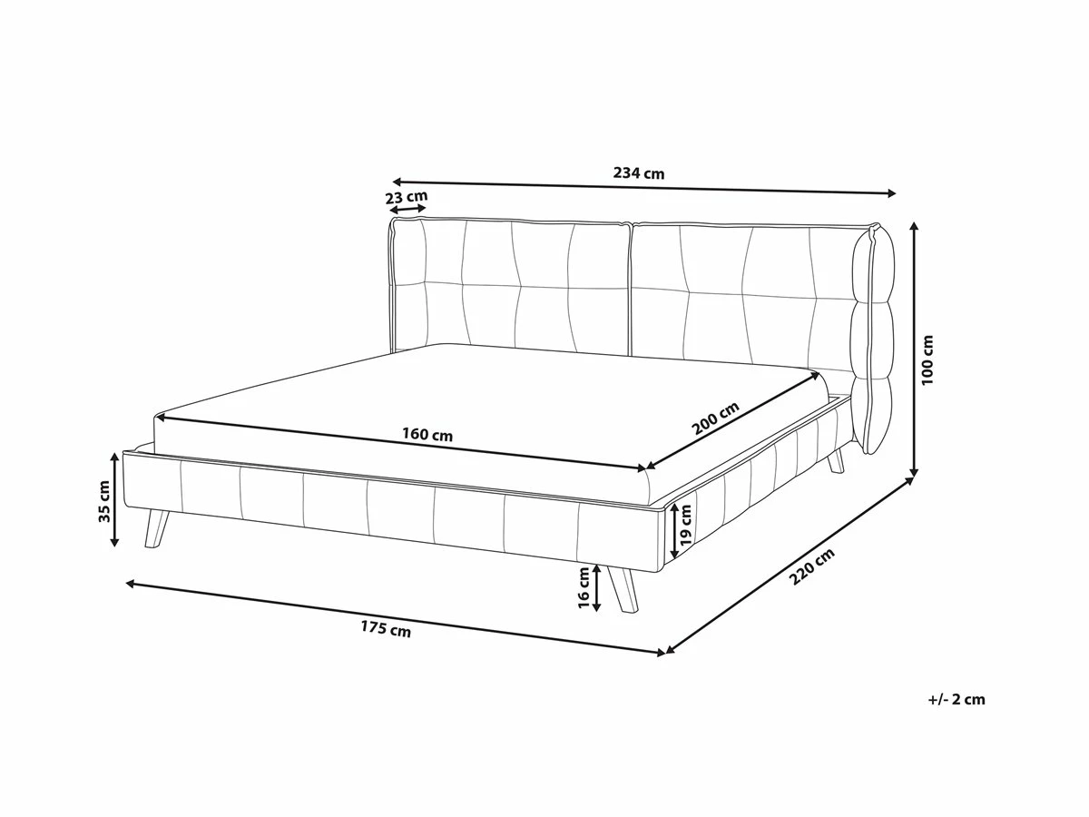 Cama de diseño moderno. Añade un toque acogedor a tu dormitorio con esta cama con somier. Está fabricada a partir de terciopelo de alta calidad. El patrón decorativo en la estructura aporta un cierto glamour. El cabecero acolchado proporciona la máxima comodidad. Detalles: Tipo de Producto: Cama matrimonial Estilo: Glamour Color: Gris Tipo de material: Poliéster aterciopelado Material principal: Terciopelo Material adicional: Madera contrachapada Composición del Material: 100% Poliéster Parte posterior tapizada: No Dimensiones: Dimensiones del reposacabezas: 234×87 Ancho: 234 cm Longitud: 220 cm Altura: 100 cm Superficie para dormir: 160×200 cm Peso: 41 kg Capacidad de peso: 250 kg La oferta incluye: 1 x Estructura de cama, 1 x Somier (26 listones flexibles, No incluye: colchón y ropa de cama Ventajas: La base de listones que absorbe los golpes proporciona un soporte perfecto, Diseño elegante, Con un clásico mechón decorativo, Materiales de la más alta calidad, Tejido aterciopelado suave como la seda Información de montaje: Requiere montaje completo. 45-60 min. Información adicional: La altura del colchón visible en la imagen es de 20 cm. Tenga en cuenta que la tela de terciopelo puede verse un poco diferente cuando se expone a una iluminación diferente: tiende a brillar más a la luz del día y parece más atenuada en la iluminación artificial interior. Debido a la estructura suave de alta densidad, el tono de la tela de terciopelo también puede variar cuando se pasa la mano en diferentes direcciones y ángulos. Para igualar el color y eliminar las arrugas, el material debe limpiarse con la palma de mano abierta en una dirección, limpiarse con un paño húmedo o una plancha con vapor. Consejos de mantenimiento: Terciopelo: 1.Aspire con un accesorio adecuado 2.Limpiar con champú seco y una esponja húmeda o un limpiador suave. Madera de abedul: 1.Seque inmediatamente después de limpiar. para evitar que se acumule agua en los muebles 2.Limpie con un limpiador y un paño suave en la dirección del grano 3.Los muebles con acabado de aceite deben engrasarse una vez al año