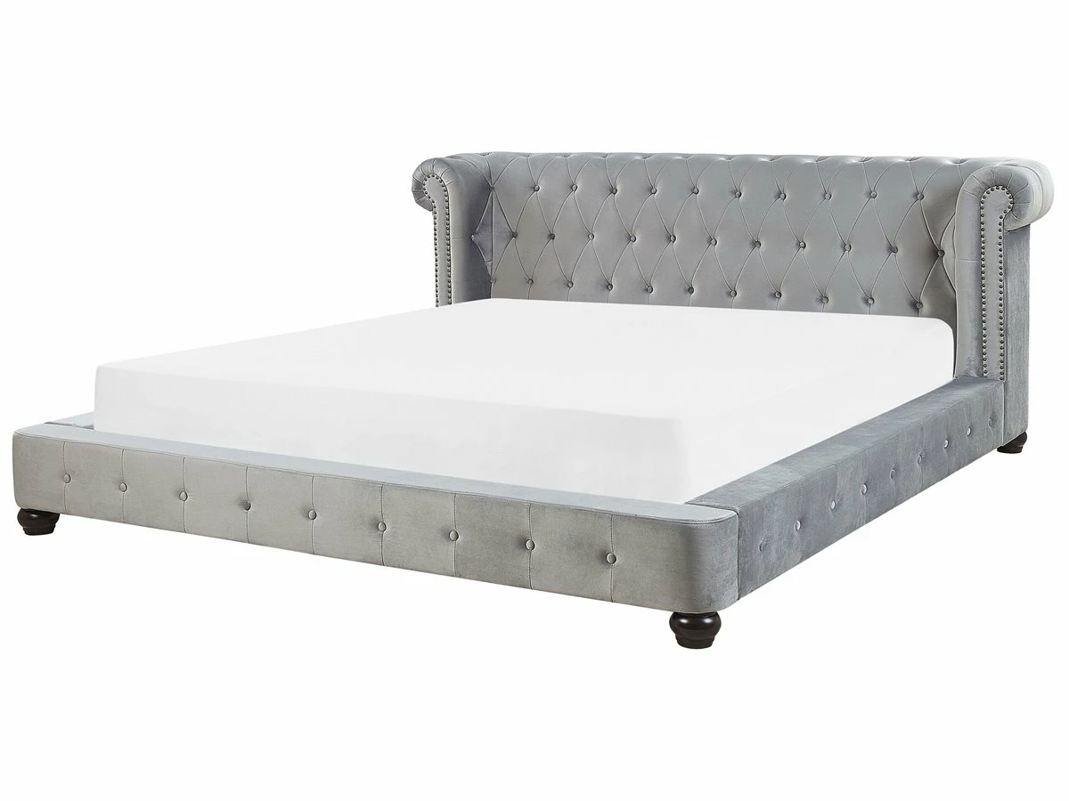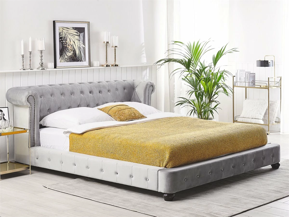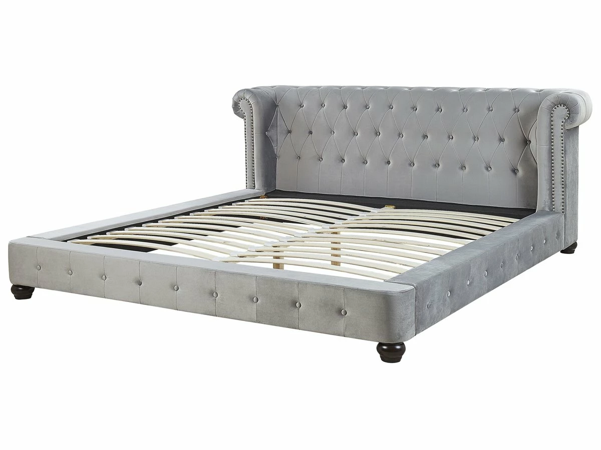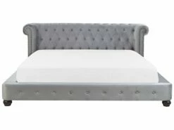 Cama de estilo Chesterfield. Esta cama con somier de inspiración vintage combina bien en cualquier dormitorio moderno o retro. Está fabricada a partir de terciopelo de alta calidad. El aspecto envejecido, el capitoné y las tachuelas aportan un toque de distinción. La decoración del cabecero está inspirada en las formas Chesterfield. Detalles: Tipo de Producto: Cama matrimonial Estilo: Glamour Color: Gris Tonalidad: Gris claro Tipo de material: Poliéster aterciopelado Material principal: Terciopelo Material adicional: Madera contrachapada Composición del Material: 100% Poliéster Parte posterior tapizada: No Dimensiones: Dimensiones del reposacabezas: 225×85 Ancho: 225 cm Longitud: 246 cm Altura: 93 cm Superficie para dormir: 180×200 cm Peso: 67 kg Capacidad de peso: 250 kg La oferta incluye: 1 x Estructura de cama, 1 x Somier (24 listones flexibles, No incluye: colchón y ropa de cama Ventajas: La base de listones que absorbe los golpes proporciona un soporte perfecto, Aspecto elegante estilo Chesterfield, Estilo retro, Combinación perfecta de colores y materiales, Estructura duradera y sólida Información de montaje: Requiere montaje completo. 20-40 min. Información adicional: La altura del colchón visible en la imagen es de 20 cm. Tenga en cuenta que la tela de terciopelo puede verse un poco diferente cuando se expone a una iluminación diferente: tiende a brillar más a la luz del día y parece más atenuada en la iluminación artificial interior. Debido a la estructura suave de alta densidad, el tono de la tela de terciopelo también puede variar cuando se pasa la mano en diferentes direcciones y ángulos. Para igualar el color y eliminar las arrugas, el material debe limpiarse con la palma de mano abierta en una dirección, limpiarse con un paño húmedo o una plancha con vapor. Consejos de mantenimiento: Terciopelo: 1.Limpiar con champú seco y una esponja húmeda o un limpiador suave 2.Aspire con un accesorio adecuado. Madera: 1.Seque inmediatamente después de limpiar. para evitar que se acumule agua en los muebles 2.Limpie con un limpiador y un paño suave en la dirección del grano 3.Los muebles con acabado de aceite deben engrasarse una vez al año