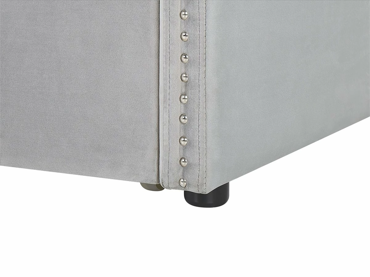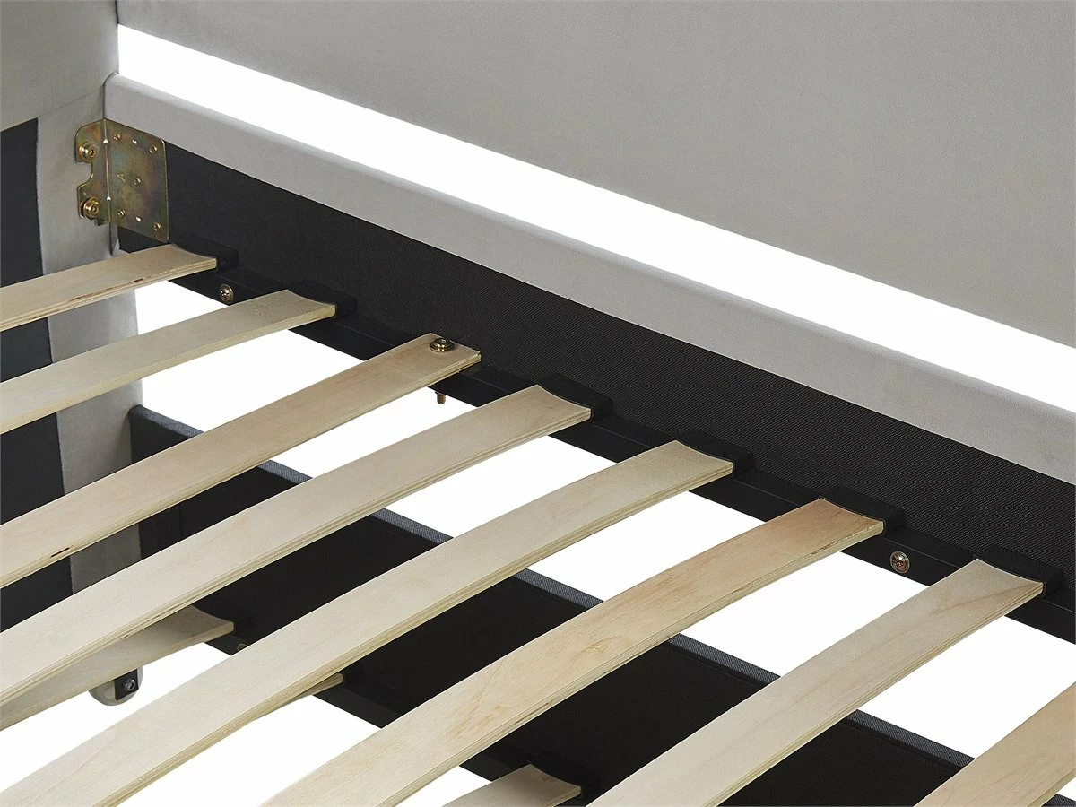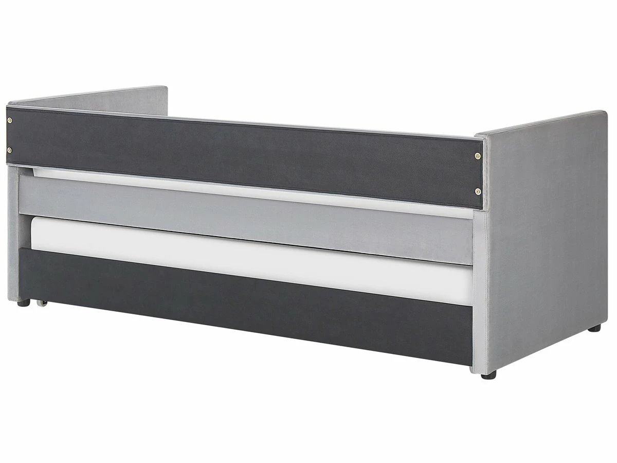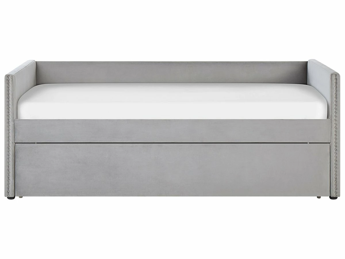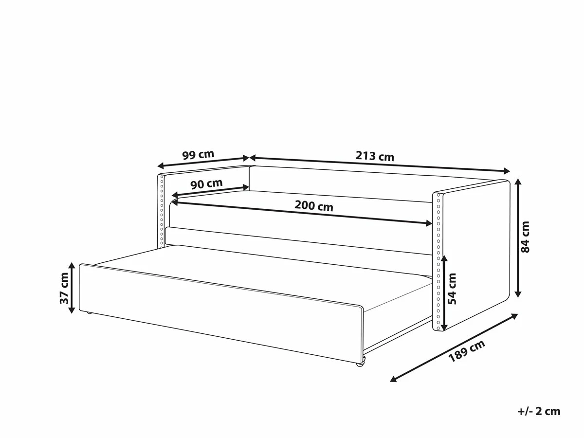 Cama nido de diseño moderno. Esta cama con somier es ideal para cualquier habitación infantil de dimensiones reducidas. Está fabricada a partir de terciopelo de alta calidad y suave al tacto. El somier de listones elásticos garantiza un sueño saludable y proporciona soporte al colchón. Las tachuelas decorativas aportan un toque de distinción. Detalles: Tipo de Producto: Sofá cama Estilo: Moderno Color: Beige Tipo de material: Poliéster aterciopelado Material principal: Terciopelo Material adicional: Madera contrachapada Composición del Material: 100% Poliéster Parte posterior tapizada: No Dimensiones: Ancho: 99 cm Longitud: 213 cm Altura: 84 cm Superficie para dormir: 90×200 cm Peso: 52 kg Capacidad de peso: 150 kg La oferta incluye: 1 x Estructura de cama, 2 x Somier (12 listones flexibles, No incluye: colchón y ropa de cama Ventajas: Segunda cama extraíble para usar si es necesario, Muy cómodo, Acabado con remaches que enfatizan la forma del mueble, Materiales de la más alta calidad, Solida estructura Información de montaje: Requiere montaje completo. 45-60 min. Consejos de mantenimiento: Terciopelo: 1.Aspire con un accesorio adecuado 2.Limpiar con champú seco y una esponja húmeda o un limpiador suave.