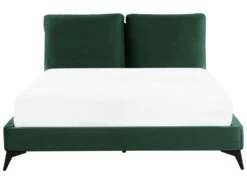 Cama de diseño moderno. Añade elegancia a tu dormitorio con esta cama con somier de diseño contemporáneo. Está fabricada a partir de terciopelo de alta calidad. El cabecero acolchado con forma de almohada aporta exclusividad en el diseño. Las patas de tamaño reducido garantizan resistencia y estabilidad. Detalles: Tipo de Producto: Cama matrimonial Estilo: Moderno Color: Verde Tonalidad: Verde esmeralda Tipo de material: Poliéster aterciopelado Material principal: Terciopelo Material adicional: Hierro Composición del Material: 100% Poliéster Parte posterior tapizada: No Dimensiones: Dimensiones del reposacabezas: 166×82 Ancho: 176 cm Longitud: 228 cm Altura: 95 cm Superficie para dormir: 160×200 cm Peso: 43 kg Capacidad de peso: 250 kg La oferta incluye: 1 x Estructura de cama, 1 x Somier (26 listones flexibles, No incluye: colchón y ropa de cama Ventajas: Apto para cualquier tipo de colchón, Combina con todo tipo de decoración, Acolchado de alta calidad, Estructura duradera y sólida, Cojines de respaldo con fundas extraíbles Información de montaje: Requiere montaje completo. 45-60 min. Información adicional: La altura del colchón visible en la imagen es de 20 cm. Tenga en cuenta que la tela de terciopelo puede verse un poco diferente cuando se expone a una iluminación diferente: tiende a brillar más a la luz del día y parece más atenuada en la iluminación artificial interior. Debido a la estructura suave de alta densidad, el tono de la tela de terciopelo también puede variar cuando se pasa la mano en diferentes direcciones y ángulos. Para igualar el color y eliminar las arrugas, el material debe limpiarse con la palma de mano abierta en una dirección, limpiarse con un paño húmedo o una plancha con vapor. Consejos de mantenimiento: Terciopelo: 1.Aspire con un accesorio adecuado 2.Limpiar con champú seco y una esponja húmeda o un limpiador suave. Madera de álamo: 1.Los muebles con acabado de aceite deben engrasarse una vez al año, 2.Seque inmediatamente después de limpiar. para evitar que se acumule agua en los muebles 3.Limpie con un limpiador y un paño suave en la dirección del grano.