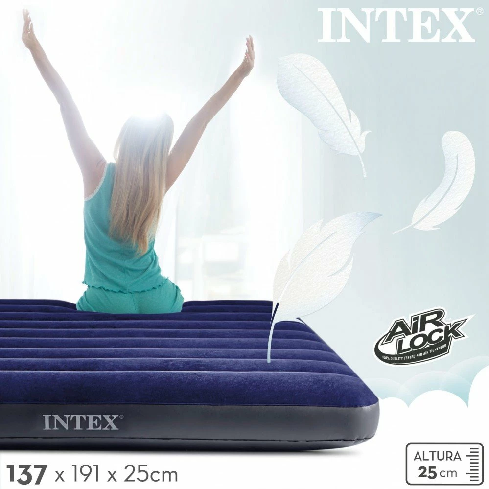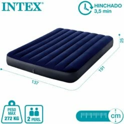 - Uso interior y para camping, colchón hinchable INTEX para dos personas, medidas 137 x 191 x 25 cm y soporta un peso de 273 kg