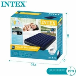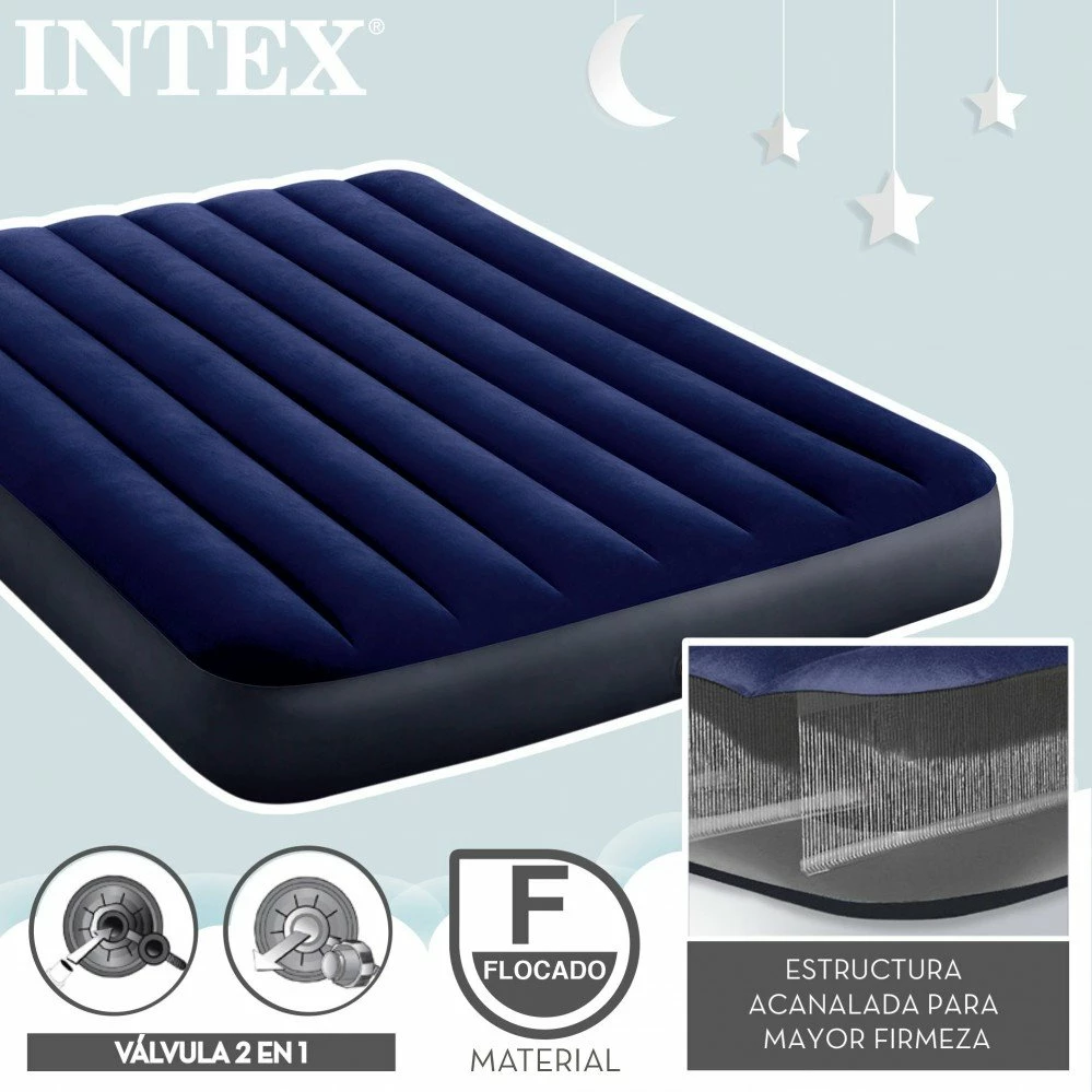 Colchón hinchable INTEX para camping o para casa. Formato doble y medidas 137 x 191 x 25 cm. Pertenece a la línea Dura-Beam Standard y al modelo Classic Downy, que ofrece colchones versátiles y resistentes en diferentes medidas. Su superficie es de tacto suave y con forma acanalada, interior con tecnología Fiber-Tech, mayor rigidez, confort y estabilidad. Válvula integrada 2 en 1 de ancho extra y tiempo de hinchado de 3,30 minutos aproximadamente. Peso máximo 273 kg.