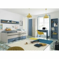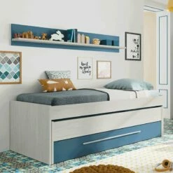 La cama nido juvenil con estante Wic es un excelente combo de muebles para dormitorio juvenil e infantil. Como cama nido, cuenta con 2 camas y una espaciosa cajonera. Incluye un estante de pared que en todo momento hace juego con el resto