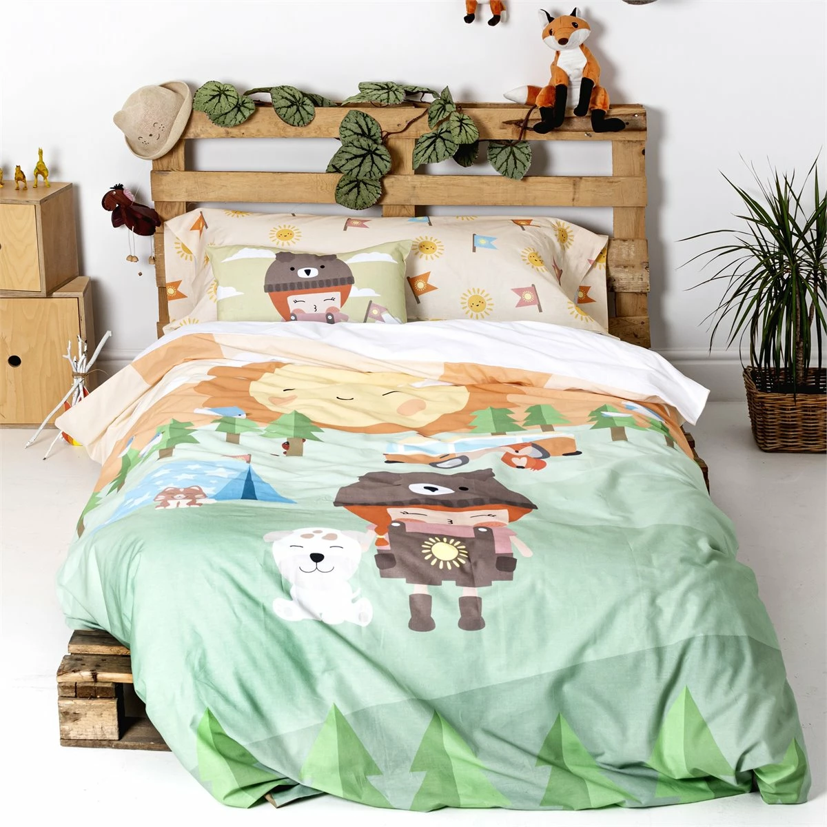 Los alegres colores de la naturaleza llenarán la habitación de tu hijo cuando cubras su cama con el juego nórdico Camping de la colección Happynois. Será feliz cada noche imaginando las aventuras más divertidas al aire libre mientras se deja llevar por sus viajes por el mundo.Esta cómoda, suave y duradera funda nórdica está hecha en España con 100% algodón de 150 hilos. Los cierres de plástico a presión hacen que sea fácil de cambiar , e incluye una divertida funda de almohada a juego.Disponible en las siguientes tallas: * 140×200 (incluye cojin estampado 63×63. * 155×220 [ Cama 80/90 ] (incluye funda de almohada estampada 45×110. * 180×220 [ Cama 105 ] (incluye funda de almohada estampada 45×125.