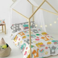 ¡Cuando el gato se va, salen los ratones a jugar! Esta historia no es cierta en la funda nórdica Cat & Mouse de la colección Moshi Moshi, donde todos se llevan bien y juegan juntos. Y cuando es hora de que tu hijo descanse, pueden elegir una puerta en la funda del cojín y entrar en un sueño profundo y tranquilo.Deja que tu pequeño sienta el tacto ligero y suave de 100% algodón de 150 hilos. Este producto de alta calidad se fabrica con orgullo en España.No incluye bajeraDisponible en las siguientes tallas: * 140×200 (incluye funda de cojín estampado 63×63. * 155×220 [ Cama 80/90 ] (incluye funda de almohada estampada 45×110. * 180×220 [ Cama 105 ] (incluye funda de almohada estampada 45×125.