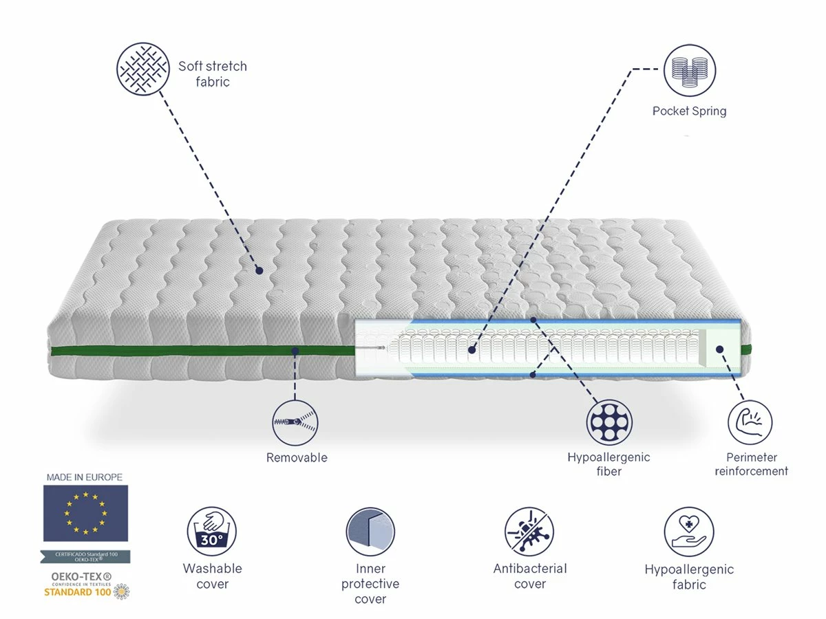 ❤️ [FICHA TÉCNICA] • La altura total: 18 cm • Firmeza: 3/5 Media • Dimensiones: Disponible en diferentes medidas. • Material del núcleo: Muelles ensacados y espuma de poliuretano altamente transpirable • Material exterior: 100% poliéster con relleno de fibra hipoalergénica • Acabados: en tonos blancos y verdes • Desenfundable y lavable El modelo GEA Muelles está pensado para adaptarse a cada etapa del crecimiento. Su firmeza es perfecta para la correcta alineación de su espalda. Con un sistema de muelles ensacados permite una ergonomía única para que crezcan sanos y fuertes. Es un colchón desenfundable y lavable, acolchado con fibra hipoalergénica. Diseño juvenil y actual. 🌙 [SUEÑO CÓMODO Y REPARADOR] Núcleo de carcasa de muelles ensacados independientes que se adapta a la forma del cuerpo durante el descanso. Los muelles tienen un marco perimetral extra firme para dar seguridad y durabilidad al colchón. Gracias a sus capas de alta espumación a ambos lados del núcleo, aseguran una postura correcta de la espalda, hombros y cuello. Cada muelle está encapsulado de forma independiente lo que permite una mayor transpirabilidad del núcleo, una mayor adaptación a cada punto del cuerpo y la ausencia de ruidos. ✅ [SUEÑO SALUDABLE] Colchón desenfundable. Tiene dos fundas. La funda exterior está formada por tejido strech suave y elástico, acolchado con fibra que combaten de manera natural la proliferación de alergias y ayudan a proteger el descanso de nuestro pequeño. La funda interior es de tejido multi elástico de protección para facilitar el desenfundado y proteger el núcleo. ✨ [GARANTIA DE SATISFACCIÓN] • Fabricación: Somos fabricantes europeos y empleamos materiales europeos • Certificados: en todos sus tejidos • Envío: enrollado con plástico en una caja de cartón protectora • Este colchón ha sido fabricado bajo mínimo impacto medioambiental y bajo los más altos estándares de calidad que garantizan la fabricación libre de sustancias nocivas.