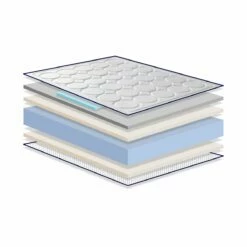 La cara superior combina las características de cuatro materiales para ofrecer el mejor resultado posible: está formada por tejido strech blanco con certificación y antibacteriano, refuerzo de látex colocado estratégicamente en la zona lumbar para dar apoyo a las zonas más débiles del cuerpo, viscoelástica gris con partículas de carbono que ayudan a regenerar el sueño y espuma suave para ayudar con la adaptabilidad.
