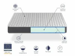 El modelo ARES con su altura de 18 cm proporciona el máximo confort y adaptabilidad a las zonas más sensibles del cuerpo. Es un Colchon de espuma con viscoelastica ideal para las camas especiales Montessori.Núcleo:Firmeza suave. El núcleo de espuma permite una buena distribución de los puntos de presión para un máximo confort.Reversible: Verano / InviernoCara superior: Tejido stretch suave. Acolchado ondulado y con espuma super soft.Cara inferior: Sistema Airfresh con tejido 3D que permite una mayor circulación del aire y ayuda a prevenir humedades. Acabado: Doble cosido reforzado en tono gris oscuro.Envío: El producto es enviado enrollado con plástico duro en el interior de una caja de cartón capaz de soportar cualquier golpe posible recibido durante el transporte.Certificado .