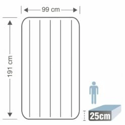 Colchón hinchable individual INTEX para camping de 99 x 191 x 25 cm, soporta hasta 136 kg. Integra bomba de hinchado de pie y válvula 2 en 1 para usar hinchador manual o eléctrico. El tiempo de hinchado es de 2,30 minutos aproximadamente. Fabricado con tecnología Fiber-Tech, para mayor estabilidad y firmeza, y en PVC laminado de acabado flocado. La base y los laterales son más resistentes al agua y se pliega compacto. Con test de hermeticidad Air Lock.