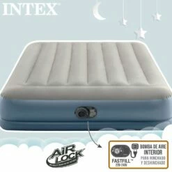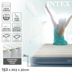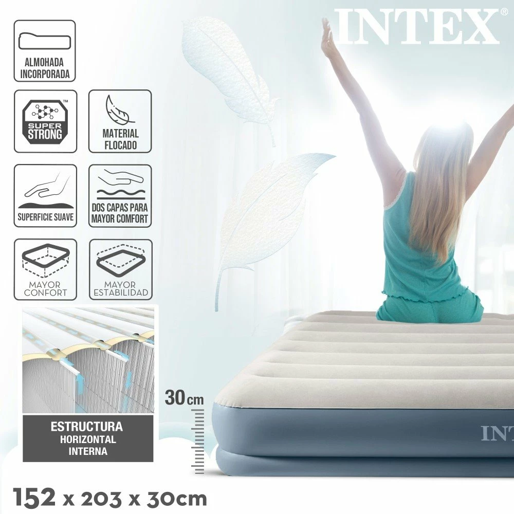El colchón hinchable Pillow Rest Mid-Rise de la gama Dura-Beam Standard INTEX es perfecto para descansar en cualquier espacio gracias a su ligereza y confort. Pensada para llevar de camping, de vacaciones o para invitados en casa. Diseñado para 2 personas (peso máximo 272 kg con medidas 152 cm de ancho x 203 cm de largo con una altura de 30 cm, cuenta con una base de vinilo y una superficie flocada y suave al tacto. Además, la zona de la almohada está ligeramente elevada para un mayor confort. Fabricado con PVC de primera calidad, con mayor resistencia al agua y construido con la exclusiva tecnología Fiber-Tech INTEX, compuesta de miles de fibras de poliéster permiten que el colchón se adapte a tu cuerpo y mantenga la firmeza en cada uso. El colchón incorpora una bomba de aire eléctrica para su inflado y desinflado con una potencia de 220/240 V para que lo tengas listo en 3 minutos, aunque se puede hinchar con una bomba manual. Además se pliega rápidamente para guardar o transportar con facilidad.