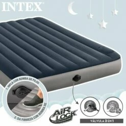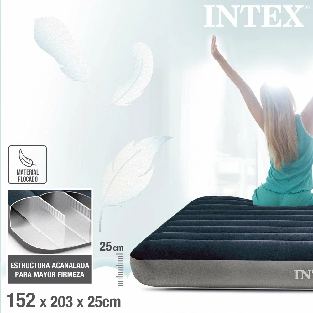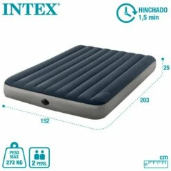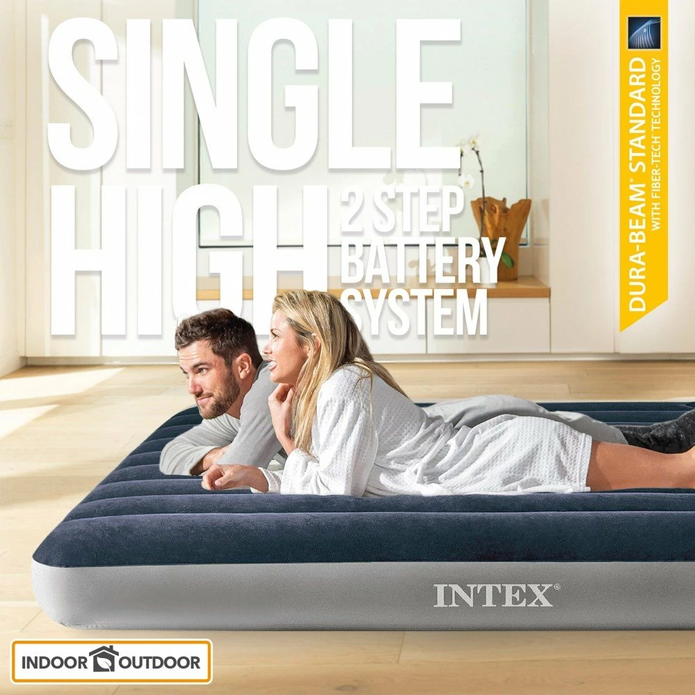 Con el colchón hinchable Single High de la gama Dura-Beam Standard INTEX es perfecto para descansar en cualquier espacio gracias a su ligereza y confort. Pensada para llevar de camping, de vacaciones o para invitados en casa. Diseñado para 2 personas (peso máximo 272 kg con medidas 152 cm de ancho x 203 cm de largo con una altura de 25 cm, cuenta con una base de vinilo y una superficie flocada y suave al tacto. Fabricado con PVC de primera calidad, que aporta una mayor resistencia al agua y construido con la exclusiva tecnología Fiber-Tech INTEX, compuesta de miles de fibras de poliéster permiten que el colchón se adapte a tu cuerpo y mantenga la firmeza en cada uso. El colchón se infla y se desinfla con facilidad con el sistema de inflado en 2 pasos con bomba a pilas y la bomba de pie, además se pliega rápidamente para guardar en cualquier rincón. Necesita 4 pilas AA (No incluidas.