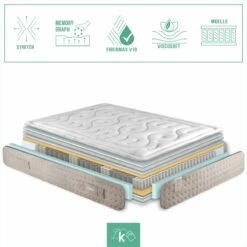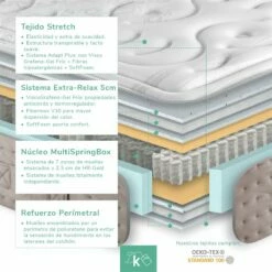 El colchón Hybrid de firmeza media-alta y adaptabilidad con VISCOGRAFENO-GEL FRIO y muelle ensacado, altura ±29cm perfecto para conseguir un gran confort y comodidad. Este colchón está compuesto por ambos lados iguales: Compuesta por Tejido STRETCH de tacto suave, cómodo y agradable, resultado de una variedad de hilos entrelazados para conseguir el máximo confort y adaptabilidad posible. Tejido con certificado OEKO-TEX, libre de sustancias tóxicas en su producción. Sistema Extra-Relax 5cm (VISCOGRAFENO-GEL FRIO. Sistema extra relax compuesto por materiales de última generación para mejorar la sensación de adaptabilidad. Compuesto por ViscoGrafeno con Gel frío, FIBERMAX V10 y SoftFoam. Acolchado con FIBERMAX V10, el resultado de seleccionar cuidadosamente fibras hipoalergénicas y someterlas a un tratamiento de iones hipoalergénico, antiácaros y antibacterianos proporcionando transpirabilidad al descanso a la vez que evita la proliferación de bacterias para una mayor higiene. Reduciendo la aparición de alergias y consiguiendo una temperatura constante del colchón. Núcleo Multi SpringBox. Núcleo compuesto por un sistema de 7 zonas de muelles ensacados y 2.5 cm de HR-Gold. El sistema de muelles totalmente independientes y embolsados cada uno en pequeños sacos de tela para evitar el roce entre el metal y eliminar posibles ruidos. Muelles ensamblados por un perímetro de poliuretano para evitar la sensación de hundimiento en los laterales del colchón. Sus 2.5 cm de HR-Gold permite una mayor sensación de confort y adaptabilidad además de evitar la sensación del muelle. Este núcleo permite un máximo confort y adaptabilidad en el descanso además de ser ideal para dormir en pareja gracias a su alta independencia de lechos.