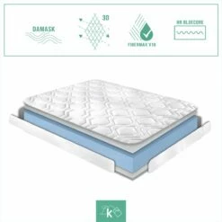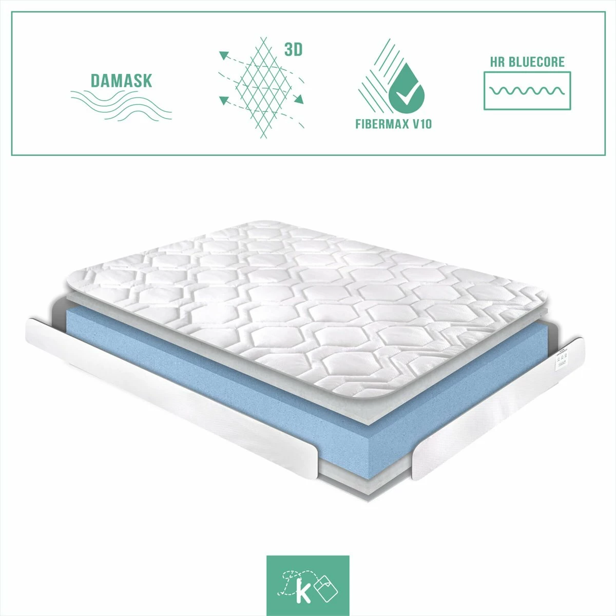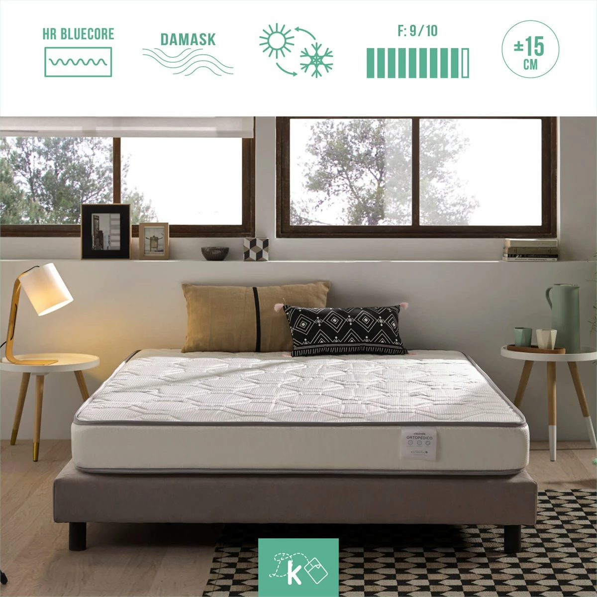 El colchón Ortopédico de firmeza alta con tejido DAMASCO con una altura de 15cm es perfecto para la mayoría de sistemas plegables consiguiendo adaptarse a cualquier tipo de camas, canapés o sofás cama. Este colchón está compuesto por dos caras: CARA DE INVIERNO. Compuesta por tejido DAMASCO de tacto suave y brillante, es higiénico y antideslizante. Le otorga a nuestro colchón propiedades altamente transpirables, ya que permite la libre circulación de aire, ventilando continuamente el núcleo de nuestro colchón mejorando su rendimiento y durabilidad. Acolchado con FIBERMAX V10. NÚCLEO. Núcleo HR-BlueCORE. Núcleo flexible de alta densidad, 23kg/m3, para un descanso estable. Material altamente adaptable y transpirable gracias a su estructura microcelular de poro abierto. Esto permite un mayor flujo de aire y reduce la posibilidad de humedades. Nuestro núcleo HR-BlueCORE presenta una gran resiliencia; tiene una gran capacidad de recuperar su estado inicial tras ser sometido a una presión, aumentando su durabilidad y confort. MATERIALES. FIBERMAX V10: Selección de tejidos hipoalergénicos, Transpirabilidad y reducción de bacterias. Tejido Damasco: Suave, higiénico y antideslizante, Altamente transpirable y Gran capacidad de ventilación. Tejido 3D Airfresh: Transpirable, Tridimensional, Flexible, Dispersor de humedad, Aislante, Ligero y Moldeable. Núcleo HR-blueCORE. Núcleo flexible de alta densidad, Densidad 23kg/m3, Material altamente adaptable, Microcelular de poro abierto y Gran resiliencia y transpirabilidad.