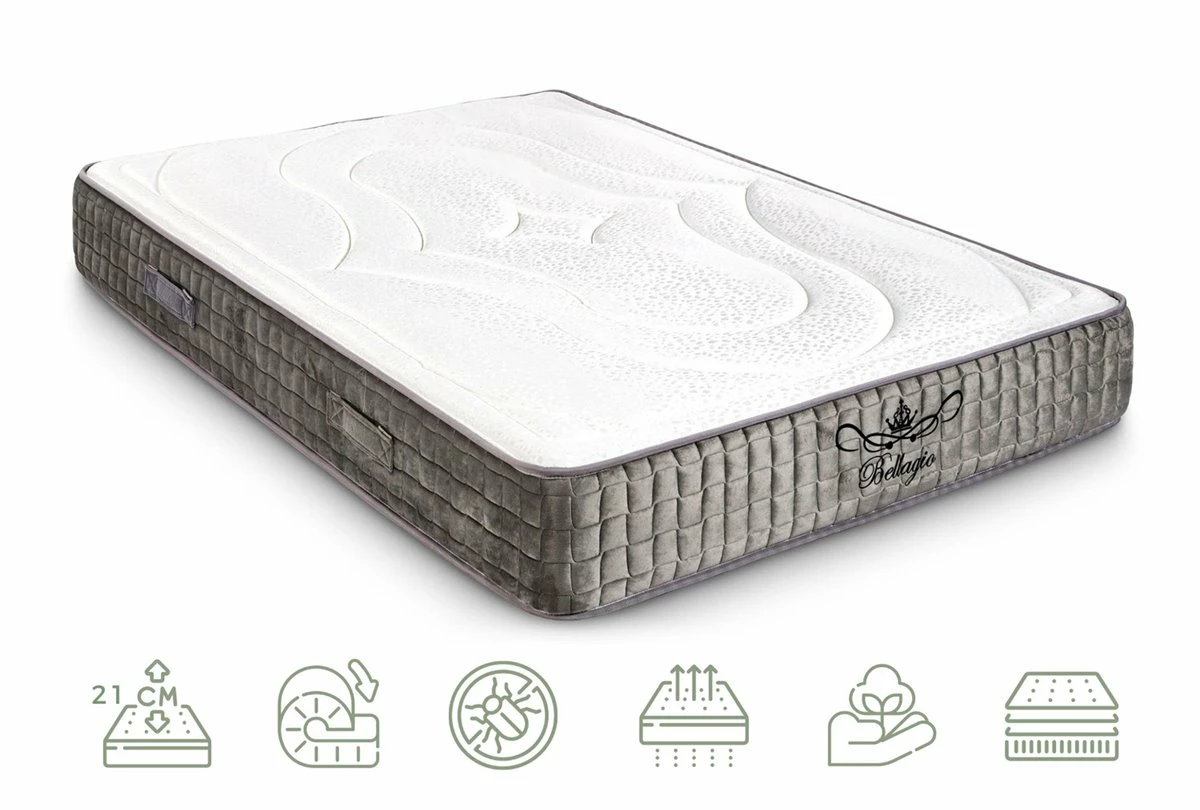 El colch贸n viscoel谩stico Bellagio Deluxe, con su n煤cleo HR total adapt, aporta diversidad y un equilibrio perfecto a la experiencia de dormir. Fabricado con materiales especiales y tecnol贸gicamente avanzados que previenen el desarrollo de microbios e impiden la multiplicaci贸n de 谩caros, bacterias y hongos. Beneficios del colch贸n viscoel谩stico Bellagio:Alto grado de elasticidad para una perfecta adaptaci贸n del cuerpo, 100% silicona, utilizado para combatir problemas como el reumatismo, descalcificaciones etc. Promueve el drenaje y la regeneraci贸n de las c茅lulas de la piel. Acolchado especial terap茅utico compuesto de fibras naturales. Ayuda a disminuir las tensiones musculares y favorecer una adecuada circulaci贸n de la sangre. M谩xima independencia de lechos, minimizando los efectos de los movimientos del acompa帽ante. Tejido natural con sistema Sanitized. Caracter铆sticas t茅cnicas: Colch贸n de 21 cm de altura con 2 cm de capa de memoria de forma densidad 55kg/m3. N煤cleo de espuma HR (alta resiliencia con estructura de c茅lulas abiertas que facilitan su ventilaci贸n. – Tejido viscosoft natural transpirable. Tejido inferior 3D de m谩xima transpirabilidad que permite garantizar el flujo del aire en un entorno 360潞. Anti-humedad. Colch贸n ergon贸mico y anat贸mico. Firmeza alta y larga durabilidad. Certificado OEKO-TEX庐 de autenticidad de los materiales empleados en su fabricaci贸n, libres de sustancias nocivas. Producto fabricado en Espa帽a. Garant铆a 2 a帽os. El precio no incluye subida a planta ni montaje.