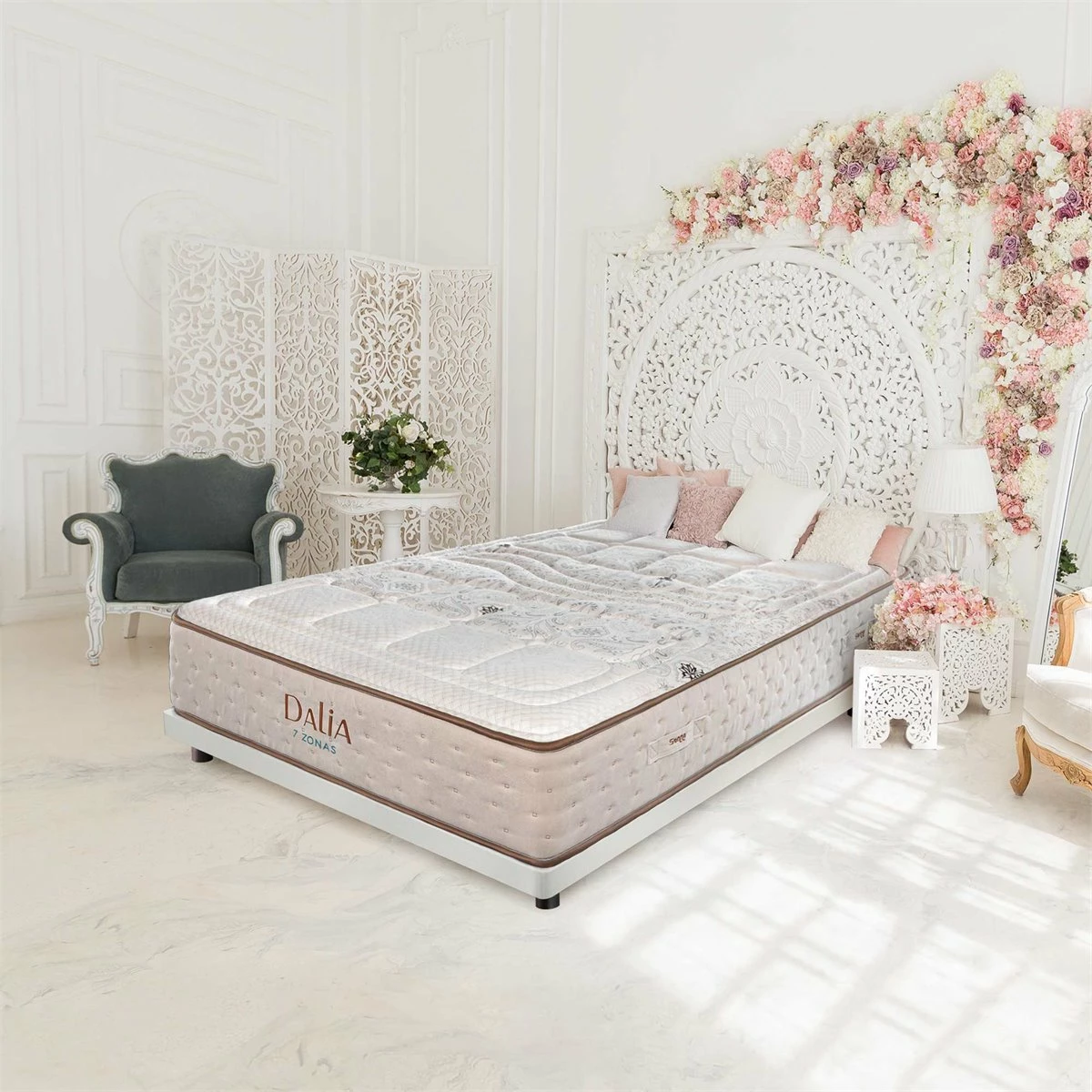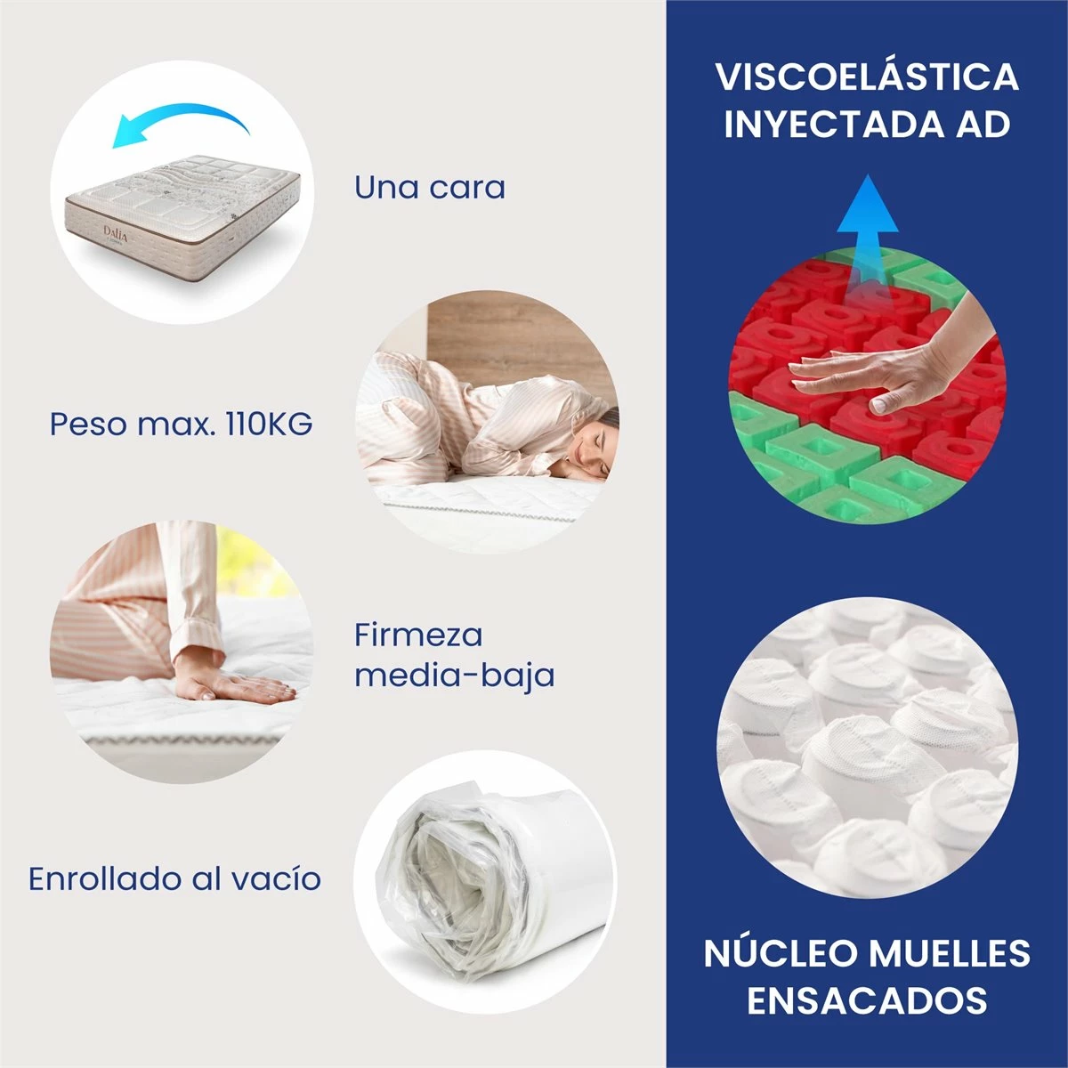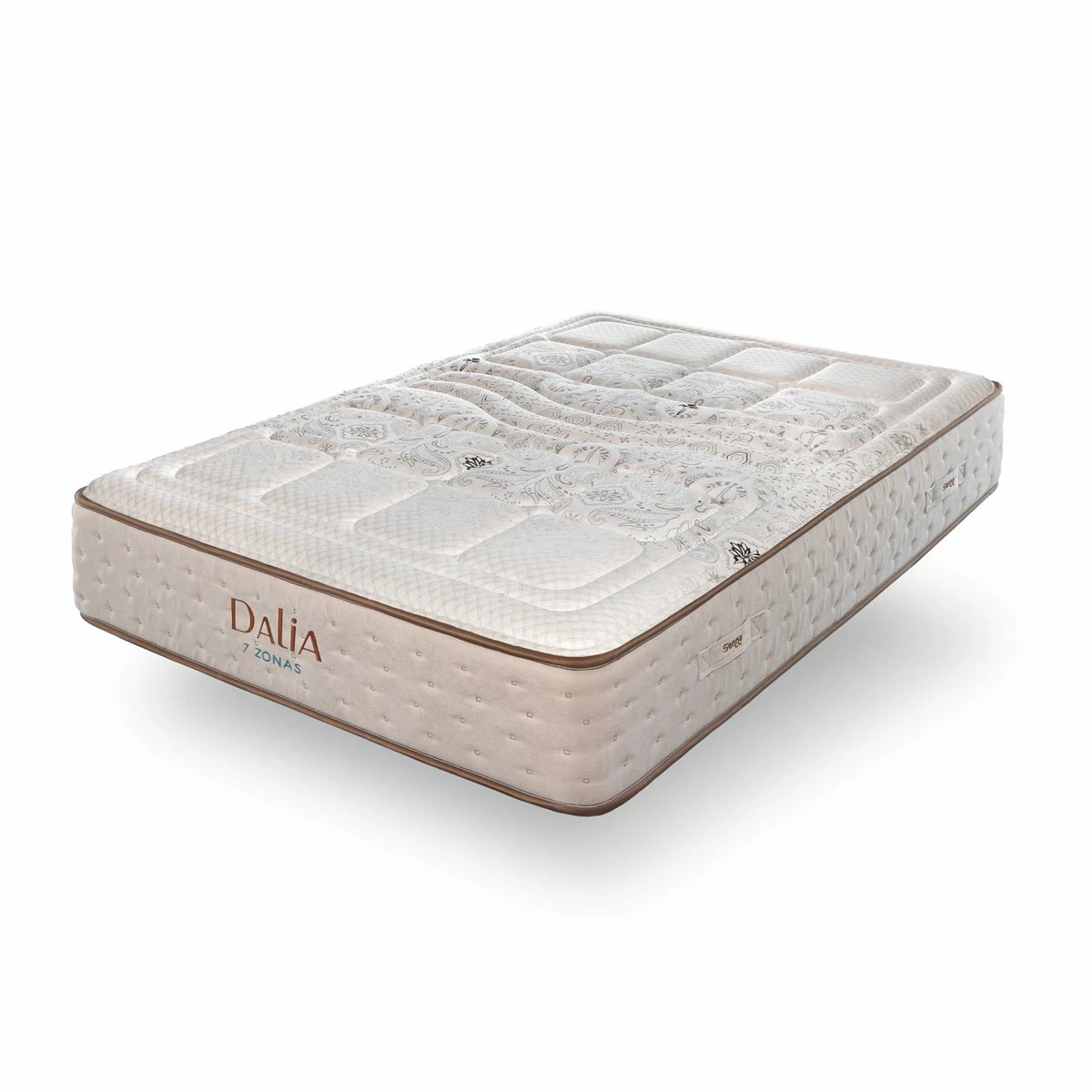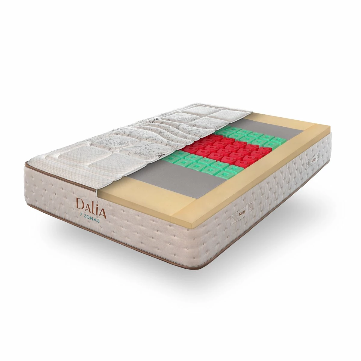 El colchón Dalia es el sueño de todo aquel que quiera dormir en una nube. Acolchado en viscoelástica en la tapa superior y con núcleo de muelles ensacados ya ofrece una comodidad muy elevada. Pero además su capa de viscoelástica inyectada con 7 zonas de descanso sobre la carcasa de muelles, hace que el colchón de adapta no solo a la silueta del cuerpo, sino a la presión que cada zona del cuerpo requiere para el descanso completo. La zona central de rosetones de viscoelástica firme ofrece el soporte perfecto para la zona lumbar, los cubos de viscoelástica más suave son perfectos para adaptarse y recoger los hombros y caderas. Los pies y cabeza descansarán perfectamente sobre la espuma de alta densidad sobre el que se apoyan. El descanso más suave y placentero en este colchón de alta gama. // CARACTERÍSTICAS: Altura total +-33 cm. Acolchado de visco+supersoft perfilado de 3,5cm en la cara superior, el primer paso para un efecto nube intenso. Carcasa de viscoelástica inyectada 7 zonas (lumbar, vico alta densidad; hombro y cadera, visco densidad más suave; cabeza y pies, espuma alta densidad. Núcleo de muelles ensacados con refuerzo perimetrales, máxima adaptabilidad y total independencia de lechos. Tejido Strech de gran calidad y suavidad con finos detalles acolchado tapa tapa. Lateral tejido Crystal extrafuerte con elegantes detalles bordados de cuadritos. Con asas en los laterales para facilitar la movilidad del colchón. Cerrado con doble ribete reforzado para mayor compactibilidad. Mayor aireación interior gracias a su núcleo de muelles ensacados. Un colchón de gama superior para los más exigentes en comodidad. Diseño elegante y fino con acabados de altísima calidad. Sistema SANITIZED anti-hongos, anti-bacterias y anti-ácaros. El colchón se envía enrollado y envasado al vacío.