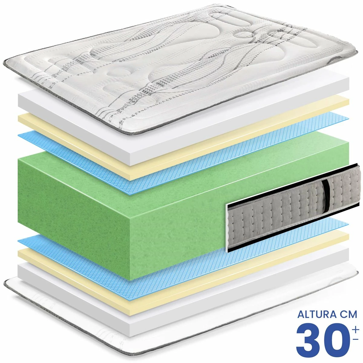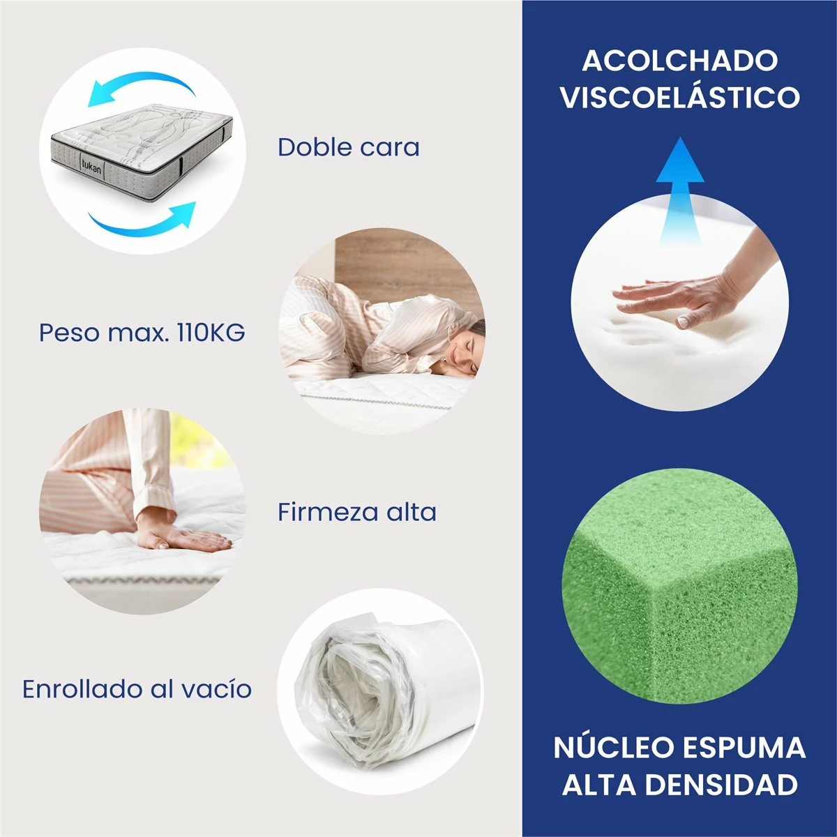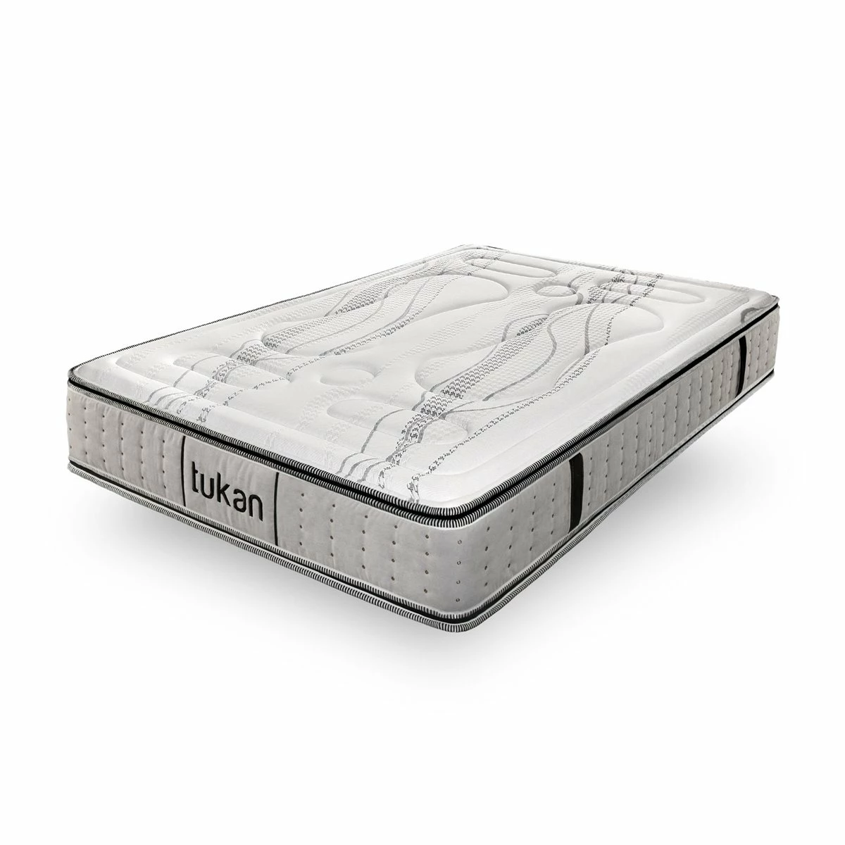 El fantástico colchón viscoelástico Tukan es perfecto para los que disfruten con el efecto nube de la viscoelástica sin renunciar a un soporte firme de espuma HR de alta densidad. Con viscoelástica en cada cara, este colchón se adapta perfectamente a tu cuerpo por ambos lados, alargando su vida útil y la comodidad de tu cama. El núcleo de espuma HR de densidad superior con microporos abiertos proporciona el soporte que tu espalda necesita y la firmeza alta que buscas. Incluye 4 asas para facilitar la movilidad. La máxima calidad en los materiales y en diseño elegante y combinable con todos los dormitorios. // CARACTERÍSTICAS: Altura total +-30 cm. Acolchado de visco+supersoft de 3,5cm en cada cara con cómoda acogida, un efecto nube intenso. Núcleo HR de microporos abiertos indeformable, de firmeza muy alta. Tejido Strech de gran suavidad y calidad en ambas caras. Lateral con falso topper de microfibra bordado Tukan, con micro canales de aireación para ventilación interior. Con asas en los laterales para facilitar la movilidad del colchón. Cerrado con doble ribete reforzado para mayor compactibilidad. Colchón de doble cara para el descanso más cómodo durante más tiempo. Diseño elegante y moderno con acabados de la más alta calidad. Sistema SANITIZED anti-hongos, anti-bacterias y anti-ácaros. El colchón se envía enrollado y envasado al vacío.