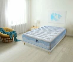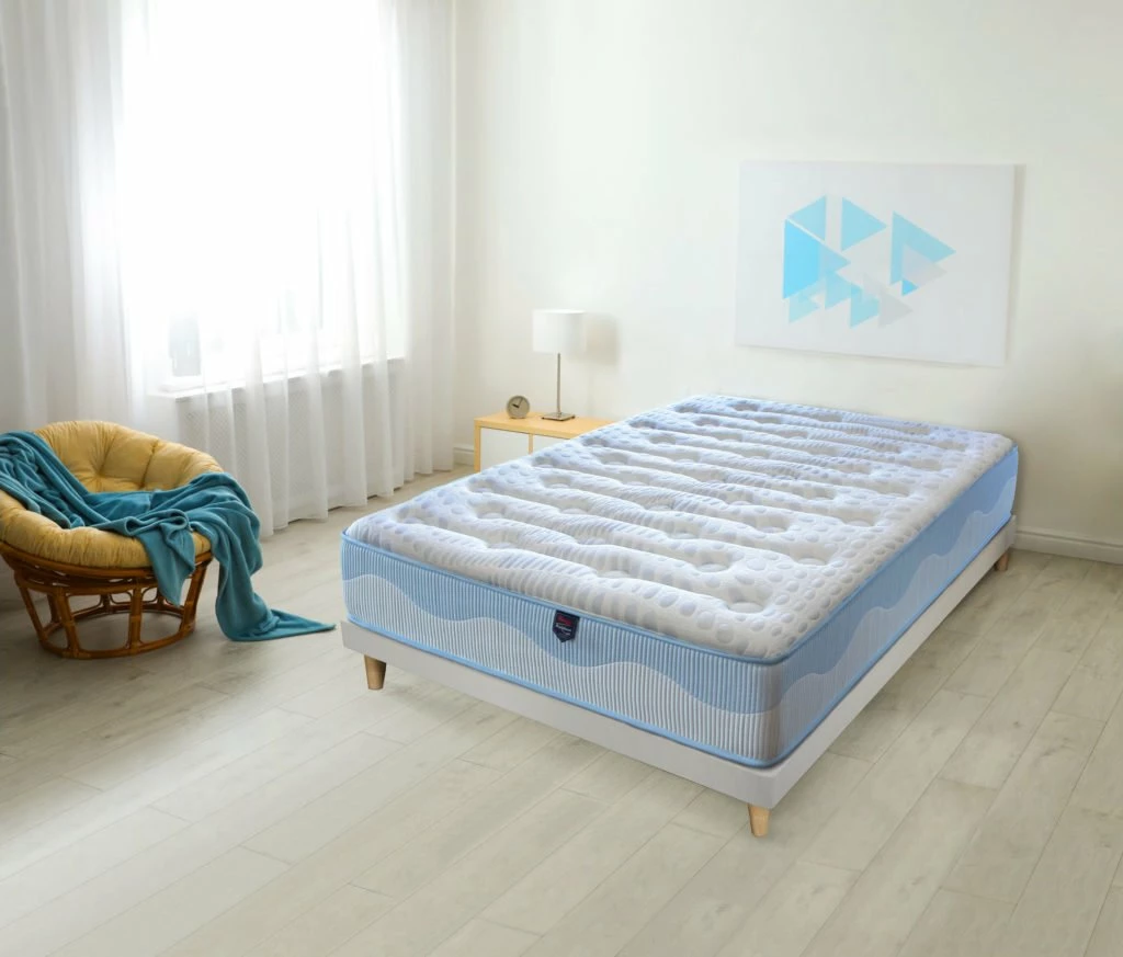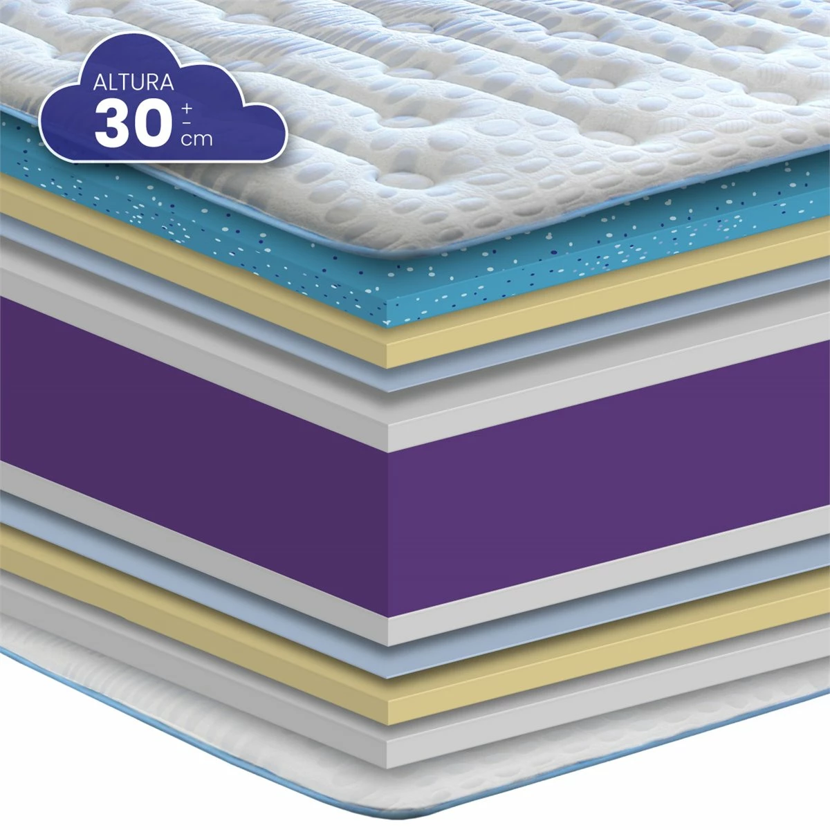 Este moderno y bonito colch贸n de alta gama cuenta con las 煤ltimas tecnolog铆as del descanso para aportar el mayor confort durante todo el a帽o. Por un lado, un acolchado con viscogel para ayudar a dispersar el calor en las noches de verano y en la otra cara, un c贸modo acolchado en viscoel谩stica para disfrutar tambi茅n del efecto nube en las noches m谩s fr铆as. Adem谩s, el n煤cleo cuenta con 2cm de viscoel谩stica a cada lado para maximizar la comodidad y acogida, proporcionando un sue帽o c贸modo y reparador. El mayor confort durante todo el a帽o con un dise帽o fresco y elegante. // CARACTER脥STICAS: Altura total +-30 cm. Cara de Verano: Acolchado de viscogel+supersoft de 3,5cm, mejora la temperatura y alarga la durabilidad, proporcionando un gran confort y una temperatura agradable. Cara de Invierno: Acolchado de viscoela虂stica termosensible+supersoft de 3,5cm con c贸moda acogida. N煤cleo HR de alta firmeza moldeado de microporos abiertos para mejorar el flujo de aire interno evitando la acumulaci贸n de calor, con 2cm de viscoel谩stica en ambas caras del n煤cleo para un confort extra. ejido Strech Blue Bubble termorregulador de alto gramaje que mantiene una temperatura constante en ambas caras. Lateral con tejido Wave azul y blanco de alta resistencia. Cerrado con ribete reforzado para mayor compactibilidad. Con 9 zonas de descanso 贸ptimo, eliminando los puntos de presi贸n y aportando un descanso completo y reconfortante. Sistema doble cara Verano/Invierno para ofrecer el mejor confort todo el a帽o. Firmeza extra acompa帽ada de un completo efecto nube gracias al dise帽o especial de su n煤cleo. Sistema SANITIZED anti-hongos, anti-bacterias y anti-谩caros. El colch贸n se env铆a enrollado y envasado al vac铆o.