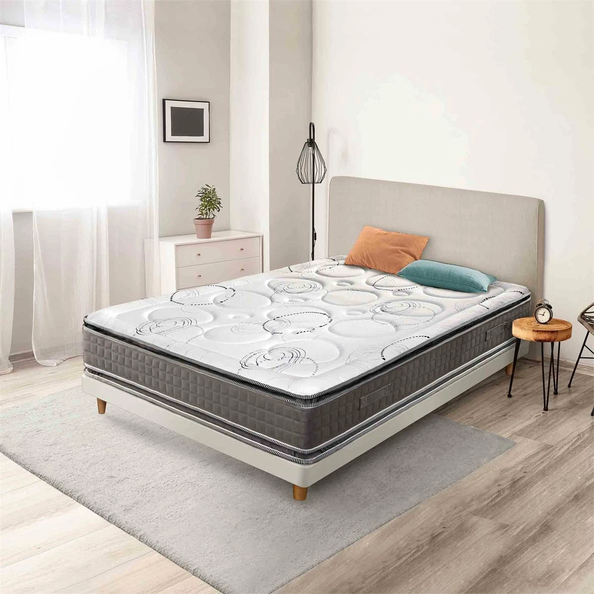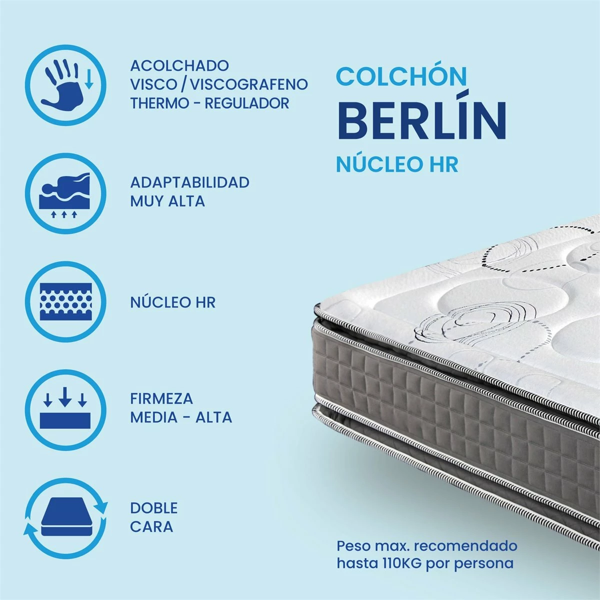 El colchón Berlín de doble cara ofrece el mejor descanso a lo largo del todo el año gracias a su doble cara de viscoelástica de grafeno para el verano y viscoelástica para el invierno. Durante la época más calurosa del año no tienes que sufrir el calor que la viscoelástica aporta, ya que las propiedades termoreguladoras del viscografeno ayudarán a mantener una temperatura ideal toda la noche. Cuenta también con características ionizantes y anti cargas estáticas, que ayudan a liberar el estrés durante el sueño y conseguir una mayor relajación. Su diseño elegante con falso topper y sus acabados de calidad hacen de este colchón el ideal para un descanso cómodo y profundo. // CARACTERÍSTICAS: Altura total +-27cm. Acolchado superior de viscografeno+supersoft de 3,5cm, especialmente pensado para el verano ya que ayuda a disipar el calor. Acolchado inferior de visco+supersoft de 3,5cm, puedes disfrutar del efecto nube durante todo el año. Núcleo HR moldeado de microporos abiertos para una perfecta aireación del colchón. Tejido Strech Orbed de alto gramaje en acolchado tapa a tapa, especialmente diseñado para la apropiada distribución del peso en ambas caras. Lateral con tejido Velour acolchado a ultrasonidos en cuadros de alta suavidad y calidad, con falso topper de doble ribete para un aspecto más exclusivo y mejor distribución de las tapas. Cerrado con ribete reforzado para mayor compactibilidad. Con asas en los laterales para facilitar la movilidad del colchón. Descanso libre de cargas estáticas gracias al viscografeno. El grafeno disipa el calor que retienen el resto de materiales, permitiendo un sueño sin acumulación extra de temperatura. Con 9 zonas de descanso óptimo. Sistema SANITIZED anti-hongos, anti-bacterias y anti-ácaros. El colchón se envía enrollado y envasado al vacío.
