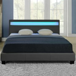 El cabecero acolchado y la iluminación LED le dan a esta cama un encanto especial.