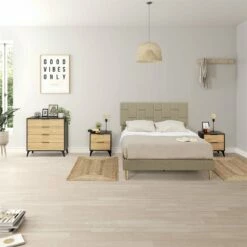 · La estructura de la cama se compone de un armazón de acero que está reforzado con un acolchado compuesto por espuma HD. Por su parte, las lamas del somier están diseñadas para minimizar el ruido mientras dormimos; además, prolongan la vida útil del colchón.
