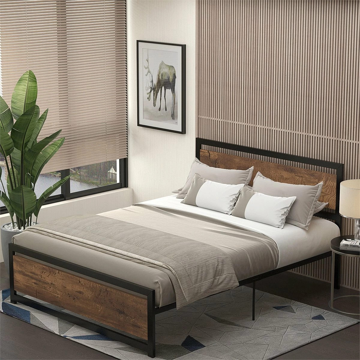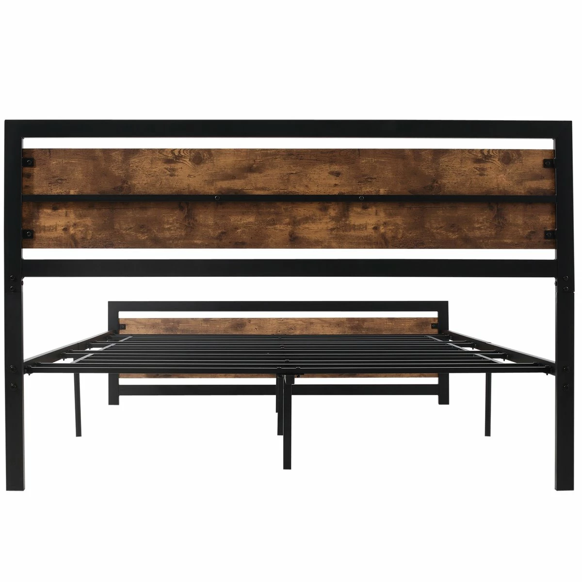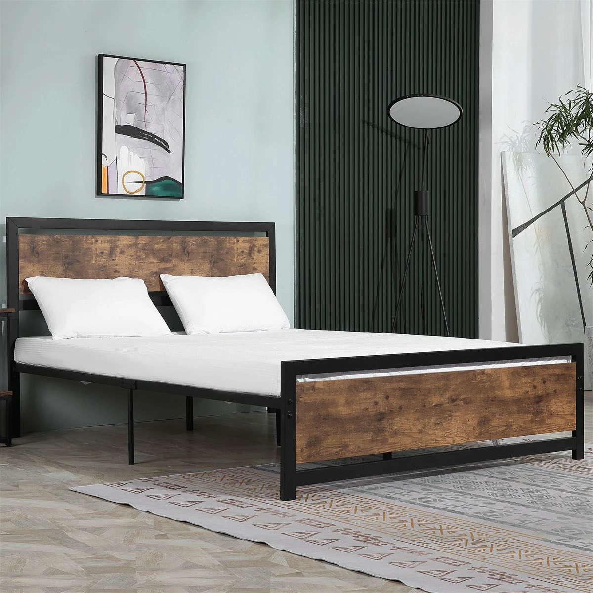 - – Esta estructura de cama de metal y madera, con pie de cama y cabecera, ofrece un estilo industrial y elegante para tu dormitorio