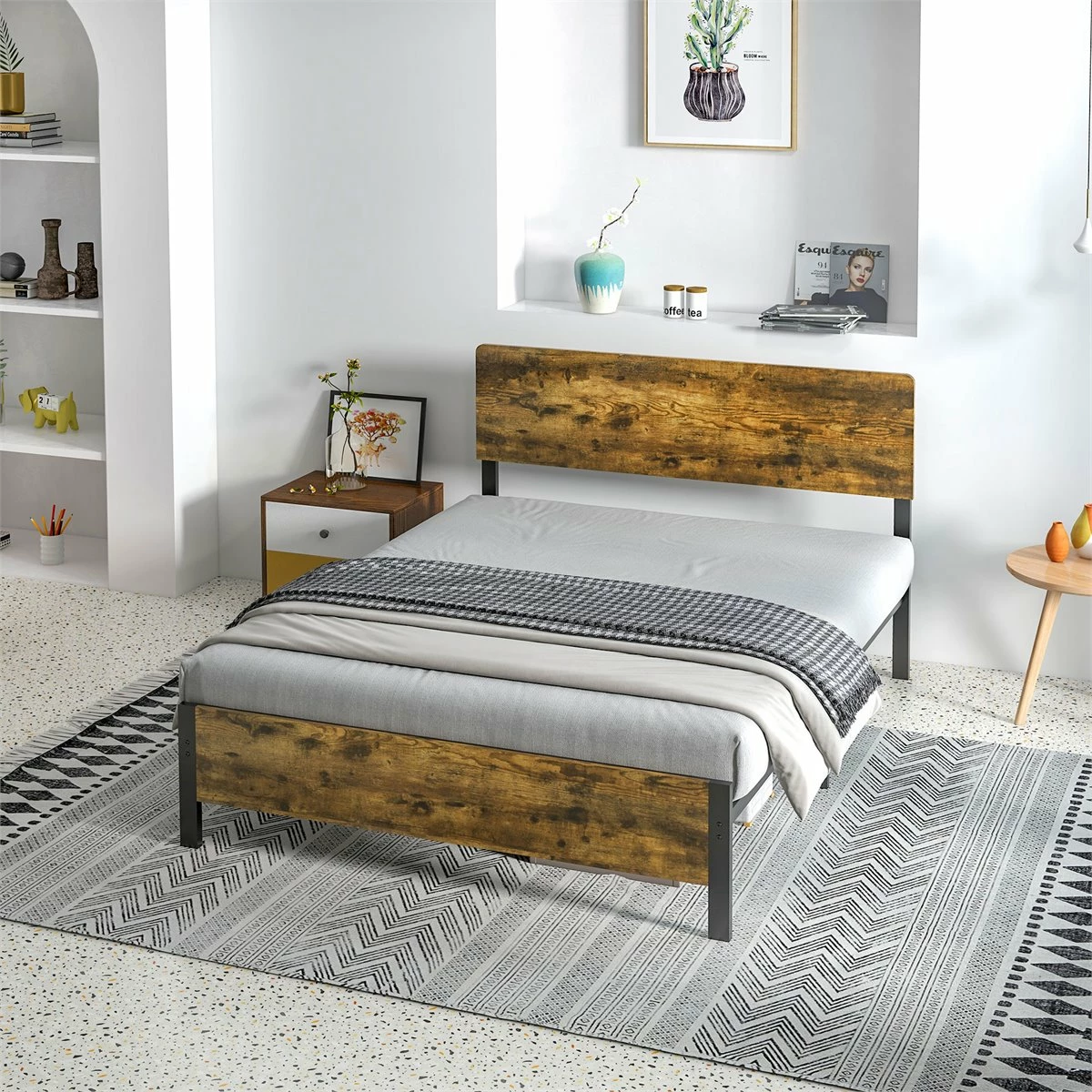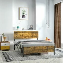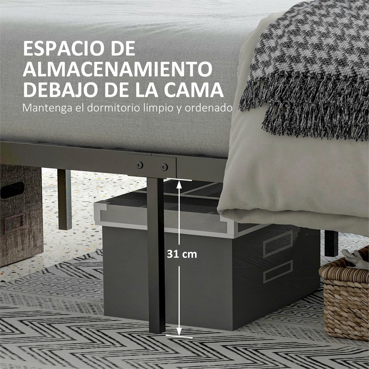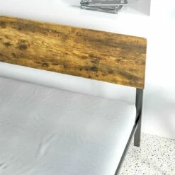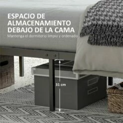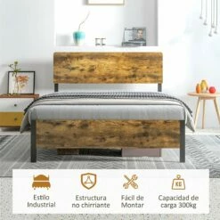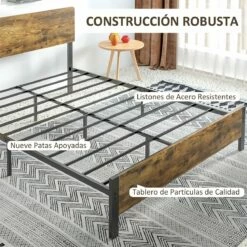 Normalmente, las personas pasamos un promedio de 6 a 8 horas durmiendo, o más. El buen sueño comienza con una buena cama. Y HOMCOM tiene el armazón perfecto para ti. Soporta hasta 300 kg de peso y aunque la estructura principal es completamente de metal, cuenta con un cabecero de melamina de madera en tono rústico que le dará el toque industrial perfecto y de elegancia al mismo tiempo. Además, podrás aprovechar el espacio de debajo para poner cajas de almacenaje si lo deseas. Características: Cama de estilo rústico que combinará a la perfección con cualquier dormitorio El tamaño doble ofrece suficiente espacio para que hasta 2 personas duerman y se relajen cómodamente Estructura resistente de metal, para dormir cómodamente sin chirridos El espacio debajo de la cama se puede usar como almacenamiento con cajas, etc. El cabecero de madera, además de añadir un toque de elegancia, también ofrece mayor comodidad y apoyo Estructura de acero resistente ideal para uso prolongado El colchón no está incluido Requiere montaje Especificaciones: Color: marrón rústico y negro Material: melamina de madera y acero Medidas totales: 162x207x104 cm (LxANxAL Medidas del colchón recomendado: 150-153×200 cm (no incluido Medidas del respaldo de la cama: 162×104 cm (LxAN Medidas del pie de la cama: 162×40 cm (LxAN Altura libre debajo de la cama: 31 cm Carga máxima: 300 kg Referencia: 831-644V03RB