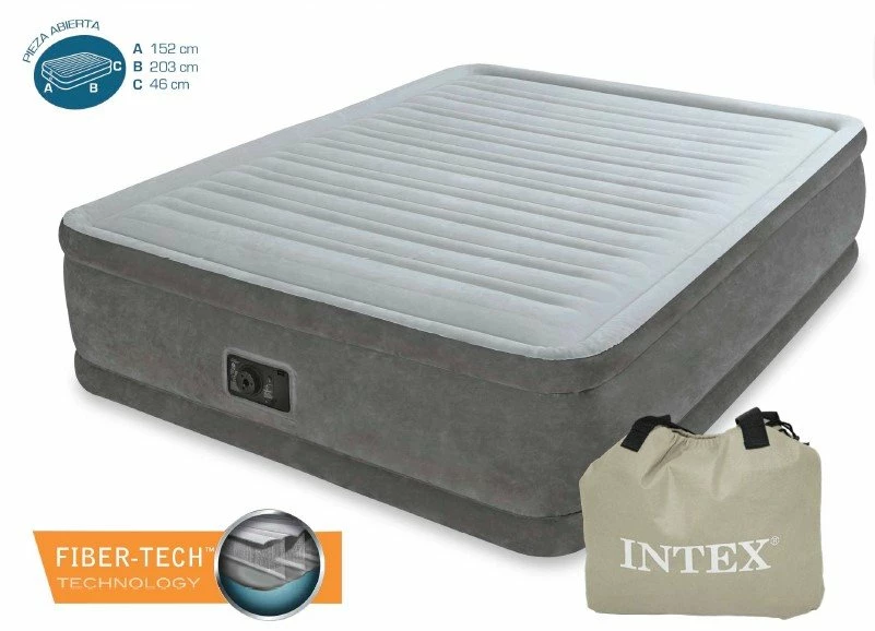 Una cama donde tú quieras. Con el colchón hinchable FIBER-TECH 2, vosotros mismos o vuestra familia descansaréis plácidamente y no tendréis que preocuparos por el espacio. Es ideal para recibir visitas en casa o para llevarlo a la segunda residencia, gracias a su fácil transporte. Este colchón presenta una gran resistencia interna, mayor durabilidad y comodidad gracias a su tecnología Fiber-Tech. Además, sus terminaciones en flocado aportan mayor suavidad y confort, además de hacerlo resistente al agua. Con su bomba eléctrica incluida, podrás inflarlo rápida y fácilmente. El colchón hinchable FIBER-TECH 2 es la solución ocasional ideal para disfrutar de una gran calidad a la hora de dormir.