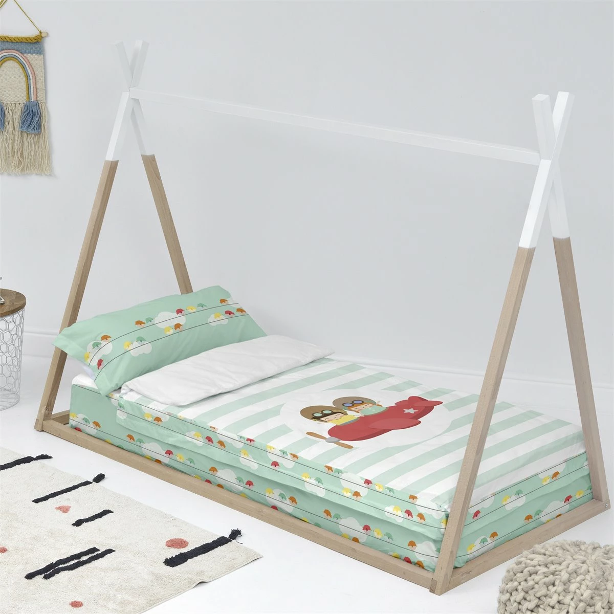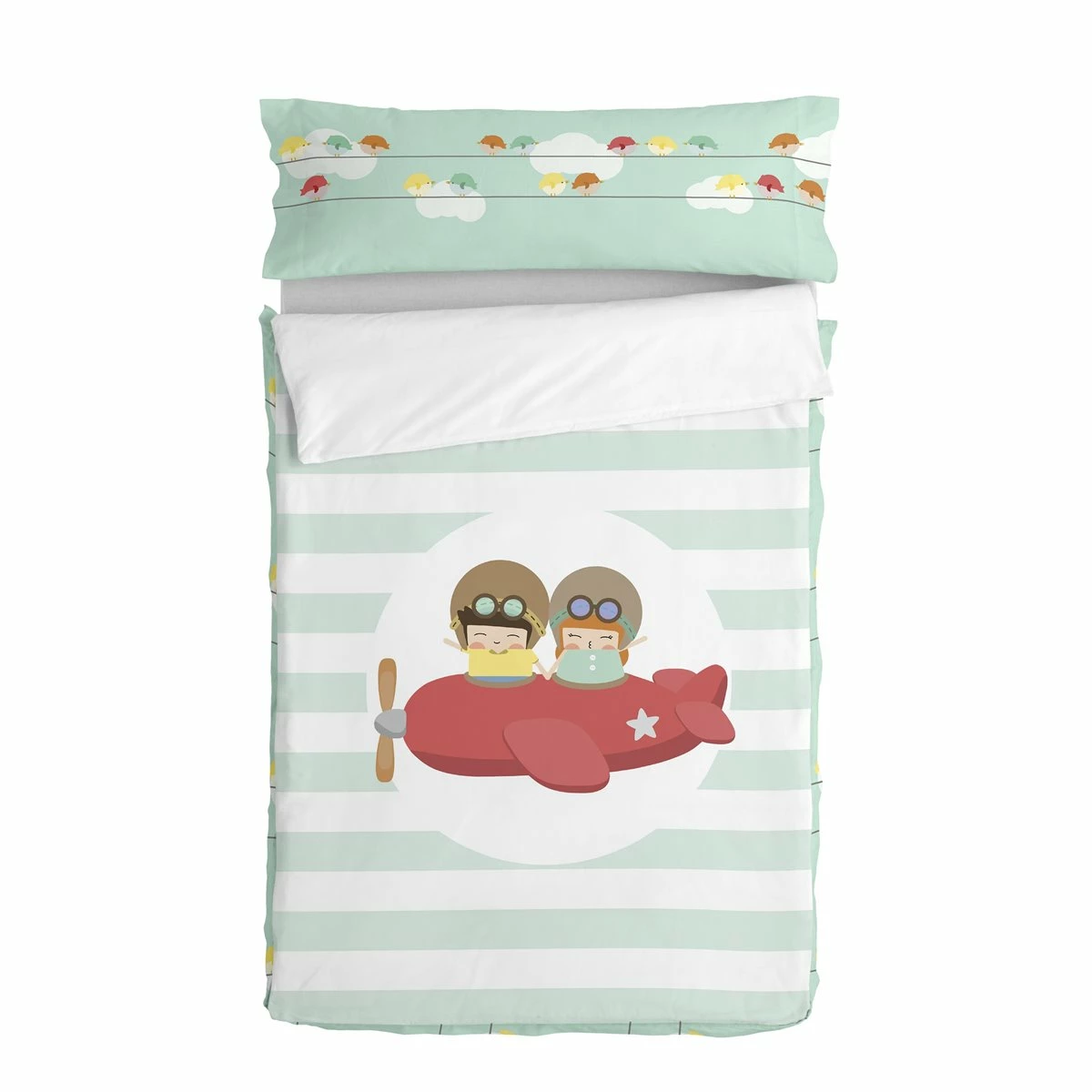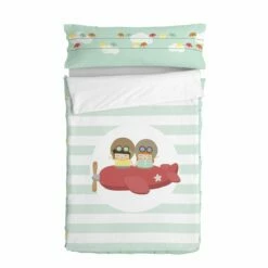 El saco nórdico Learning to Fly de la colección Happynois nos transporta a un intrépido mundo de pilotos, volando a través de cielos ligeramente nublados, rodeado de coloridos pájaros. ¡Que comience la aventura!La funda nórdica 100% algodón y la sábana ajustable crean un ambiente aventurero, y se unen con una cremallera oculta para evitar que tu hijo se destape durante la noche.Saco nórdico con relleno compuesto por funda nórdica, relleno nórdico, sábana bajera ajustable y funda de almohada todo 100% algodón de 150 hilos. Saco nórdico sin relleno compuesto por funda nórdica, sábana bajera ajustable y funda de almohada todo 100% algodón de 150 hilos. Disponible en las siguientes tallas: * 90×200 * 105×200