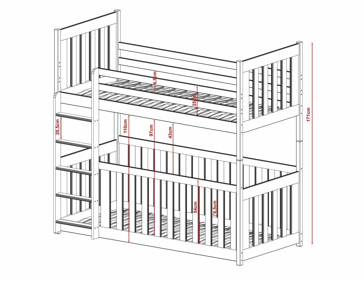 Litera de Cris: crea un dormitorio mágico para sus hijosLa litera Cris es una oferta ideal para dos niños. Hicimos un mueble hecho de madera de pino sólida, la longevidad está garantizada. El cris cot es una combinación de funcionalidad y hermoso diseño. Utilizamos una barandilla de madera aquí, también hay una escalera: la habitación de los niños se vuelve más viva con este mueble. La litera Cris ofrece muchas opciones de configuración. Puede elegir principalmente uno de los muchos colchones para la parte inferior y la parte superior. También es posible cambiar la distancia y la barandilla.