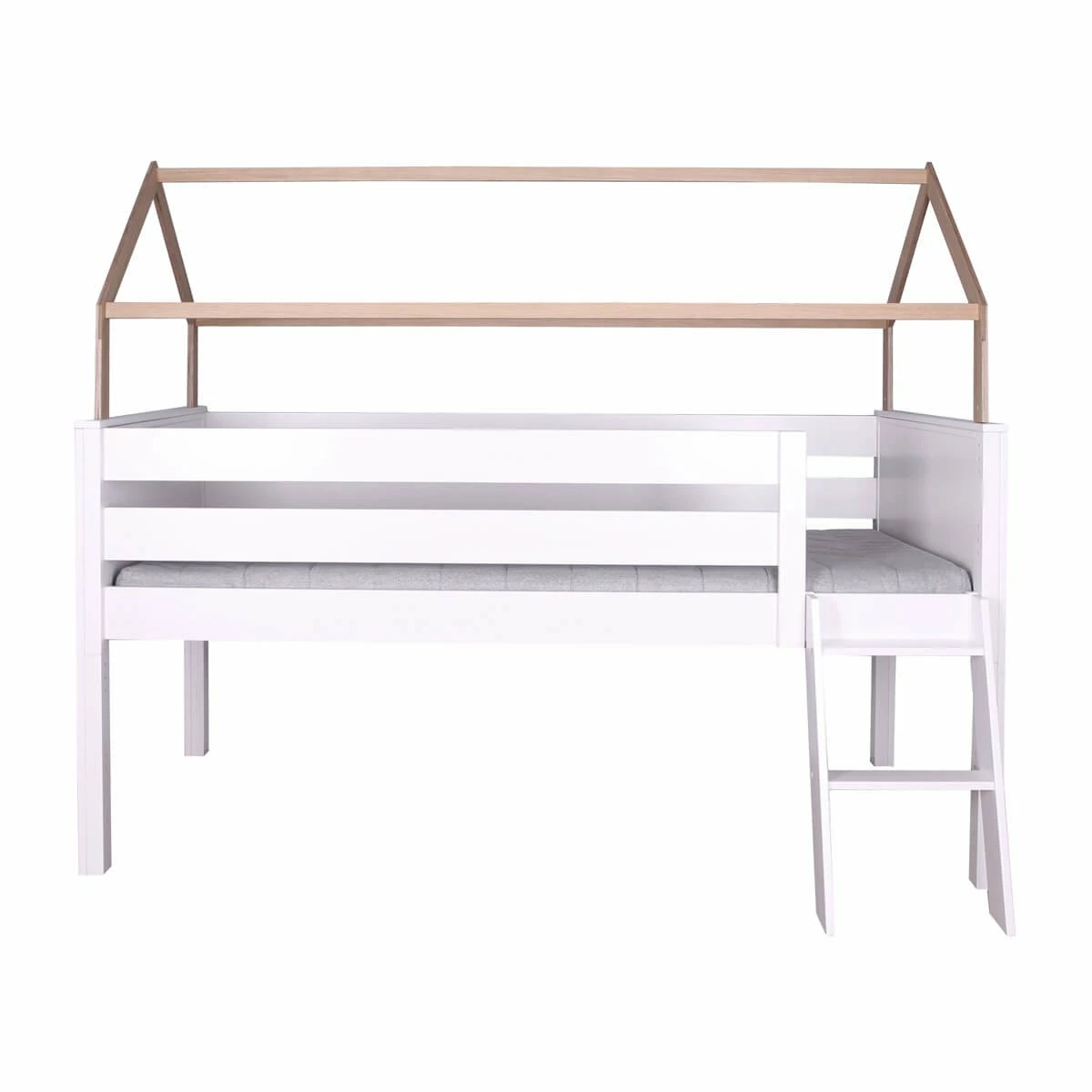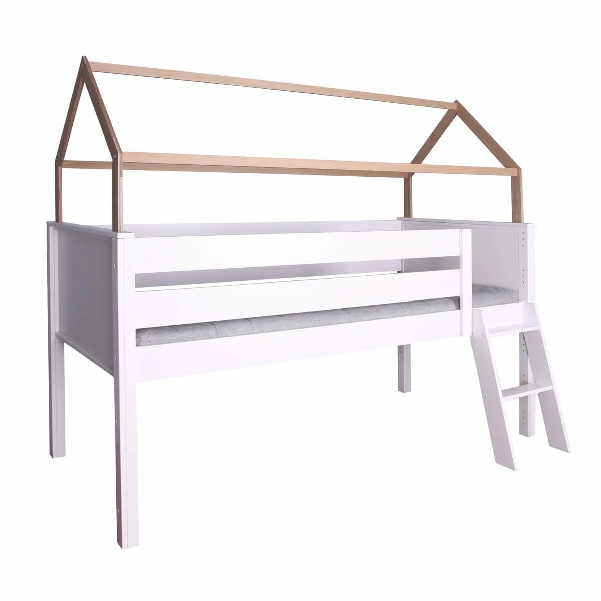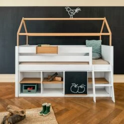 ¡Juega, diviértete y duerme! Esta cama de media altura con protección anticaídas alta te ofrece todas estas posibilidades. Además incluye un divertido techo en forma de casita, que puedes cubrir con telas de alegres colores (disponibles por separado y crear un acogedor refugio para que tu peque pueda relajarse, leer, jugar o inventar miles de aventuras. Aprovecha el espacio que tienes debajo de la cama para crear un cómodo rincón de juegos o tener más espacio de almacenamiento colocando las estanterías de la misma colección.