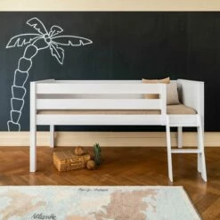¡Juega, diviértete y duerme! Esta cama de media altura con protección anticaídas alta te ofrece todas estas posibilidades. ¡A qué peque no le gusta dormir un poco más alto, para dejar volar la imaginación y vivir emocionantes aventuras! Aprovecha el espacio que tienes debajo de la cama para crear un acogedor rincón o tener más espacio de almacenamiento. Disponible por separado accesorios super divertidos y muy decorativos.