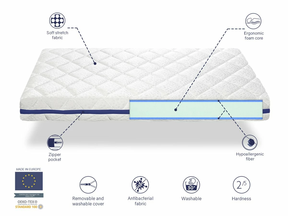 ❤️ [FICHA TÉCNICA] La altura total: 11 cm Firmeza: 2/5 Suave Dimensiones: Disponible en diferentes medidas. Material del núcleo: Espuma de poliuretano altamente transpirables Material exterior: 100% poliéster con relleno de fibra hipoalergénica Acabados: en tonos azules y blancos Desenfundable y lavable. Contenido del pack: Colchón Hermes + almohada viscoelástica junior + Protector de colchón🛌 [SUEÑO CÓMODO Y REPARADOR] Presentamos el colchón Hermes. Su núcleo está fabricado con espuma de gel especialmente diseñada para absorber y liberar activamente el calor del cuerpo para un sueño más fresco. Además, cuenta con poros ligeramente abiertos para asegurar una buena disipación del calor.Colchón desenfundable. Tiene dos fundas. La funda exterior está formada por tejido strech suave y elástico en su cara superior. Está acolchada con fibra anti ácaros que combaten de manera natural la proliferación de alergias y ayudan a proteger el descanso.✅ [ALMOHADA VISCOELASTICA JUVENIL]La almohada viscoelástica se adapta por completo a tu cuerpo para garantizar cada noche la mejor postura para el cuello. Su núcleo 100% de espuma viscoelástica de 50kg/m3, está formado con canales de aireación para permitir el paso del aire y disipar del calor. Alivia tensión de cuello y cervicales. Suave acogida, adaptable sin hundir la cabeza. La altura de la almohada es de 7 cm lo que permite mantener la postura perfecta para nuestro pequeño.Cuenta con dos fundas. La funda exterior está confeccionada con tejido natural y de alto gramaje compuesto tejido strech elástico. La funda interior es de protección.[SÁBANA PROTECTORA DE COLCHON]Protector de colchón absorbente y silencioso. Impermeable y muy transpirable: la membrana de poliuretano bloquea perfectamente todos los líquidos, la transpiración, la orina y los fluidos corporales dejando pasar el aire.Hipoalergénico y Suave. Composición sábana de rizo: 50%tencel, 50% poliéster con base de poliuretano. Faldón ajustable: 100% poliéster.Tratamiento antiácaros y antibacteriano que impide la proliferación de ácaros y bacterias. Actúa como barrera higiénica y mantiene el colchón protegido.✨ [GARANTIA DE SATISFACCIÓN] Fabricación: Somos fabricantes europeos y materiales europeos Certificados: Envío: enrollado con plástico en una caja de cartón protectora